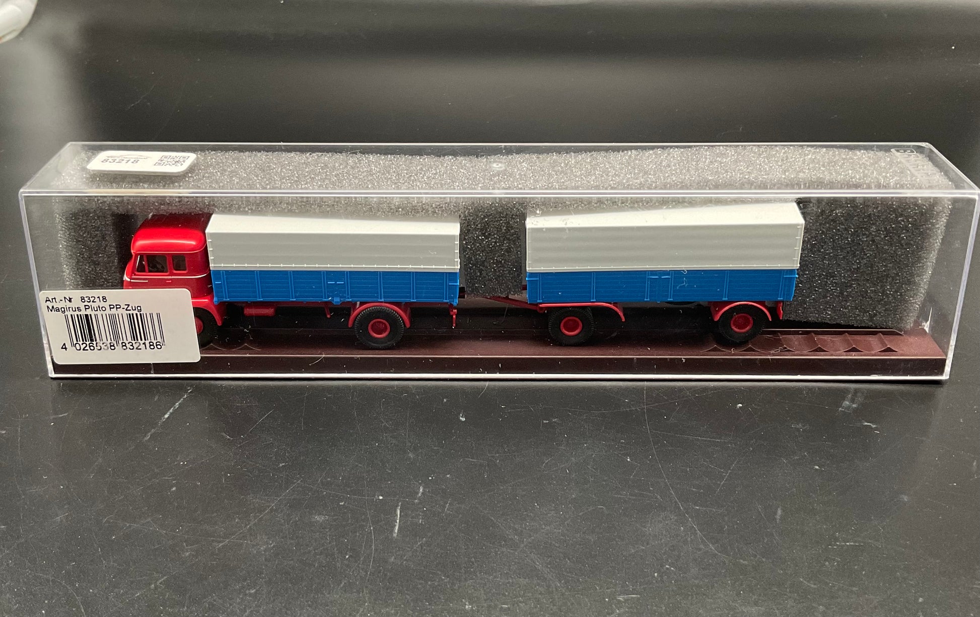 Es handelt sich um ein Brekina LKW mit Zug in Blau,Beige,rot. Das Modellfahrzeug ist Original von Brekina und ist gebraucht. Zustand entsprechend den Bildern. Nicht für kleine Kinder.