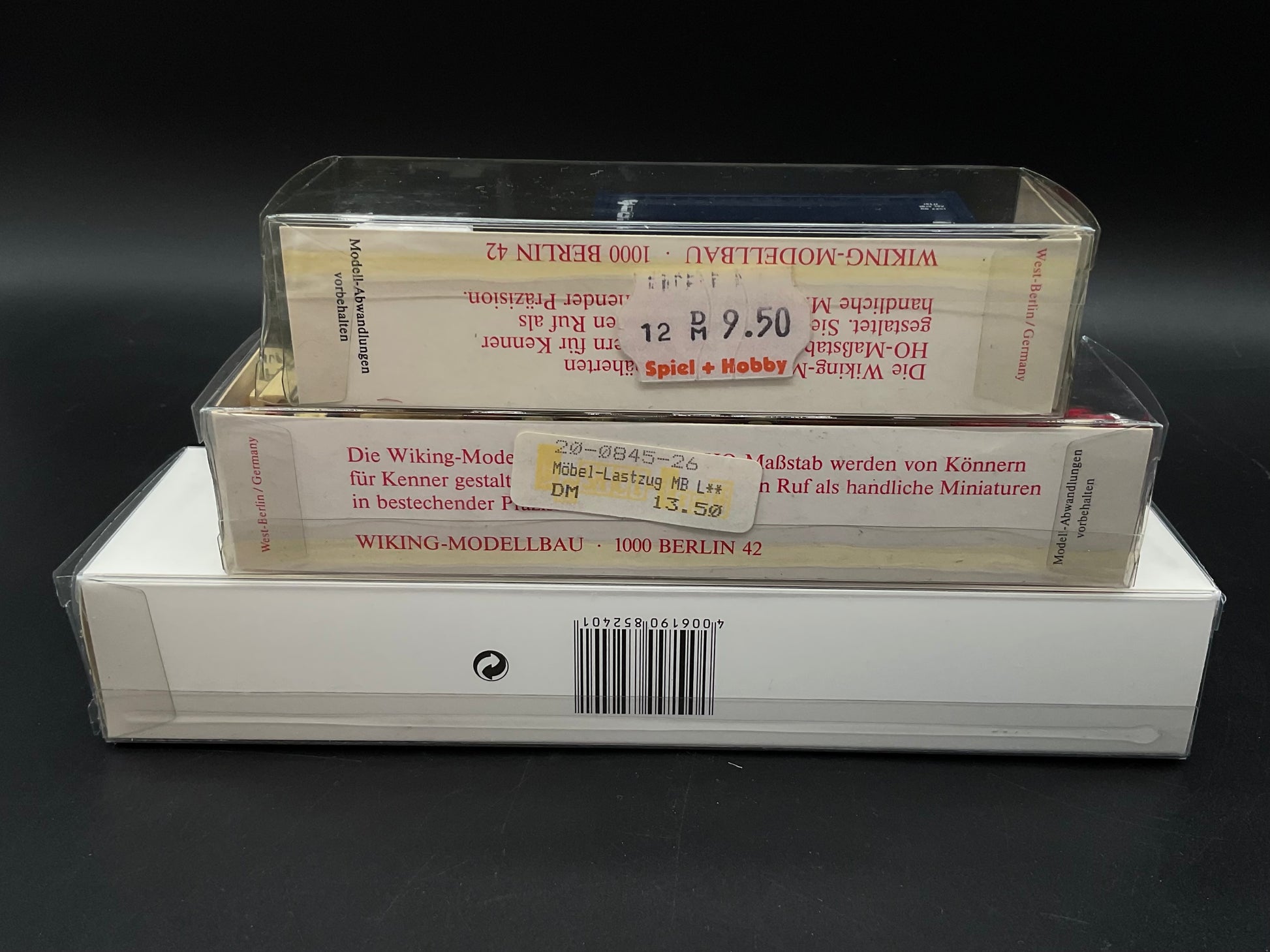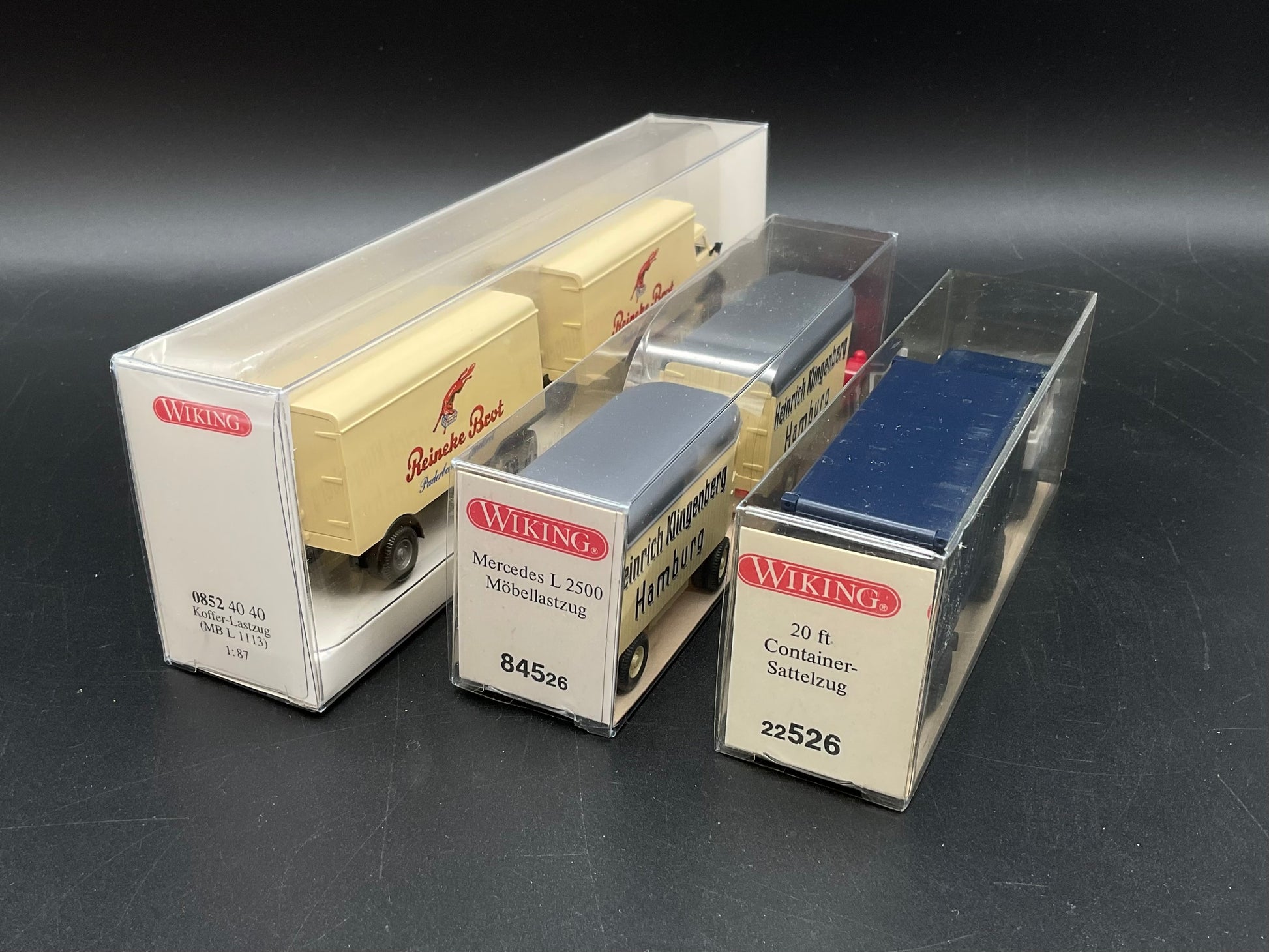 Es handelt sich hierbei um ein Mercedes Benz Koffer-Lastzug mit der Modellnummer 0852 40 40, einmal um ein Mercedes L 2500 Möbellastzug mit der Modellnummer 845 26 und einmal um ein Container-Sattelzug mit der Modellnummer 22 526. Das Fahrzeugset ist Original von Wiking und gebraucht. Daher weist es kleine Gebrauchsspuren auf. Zustand entsprechend den Bilder und die Bilder dienen der Beschreibung.