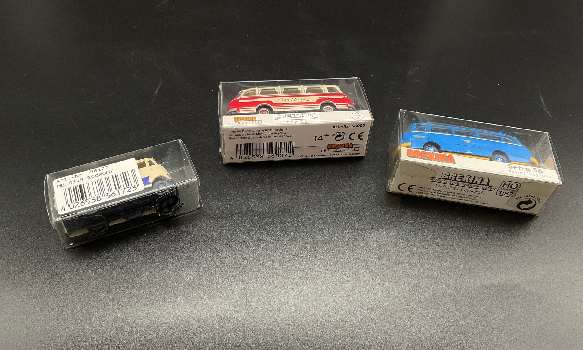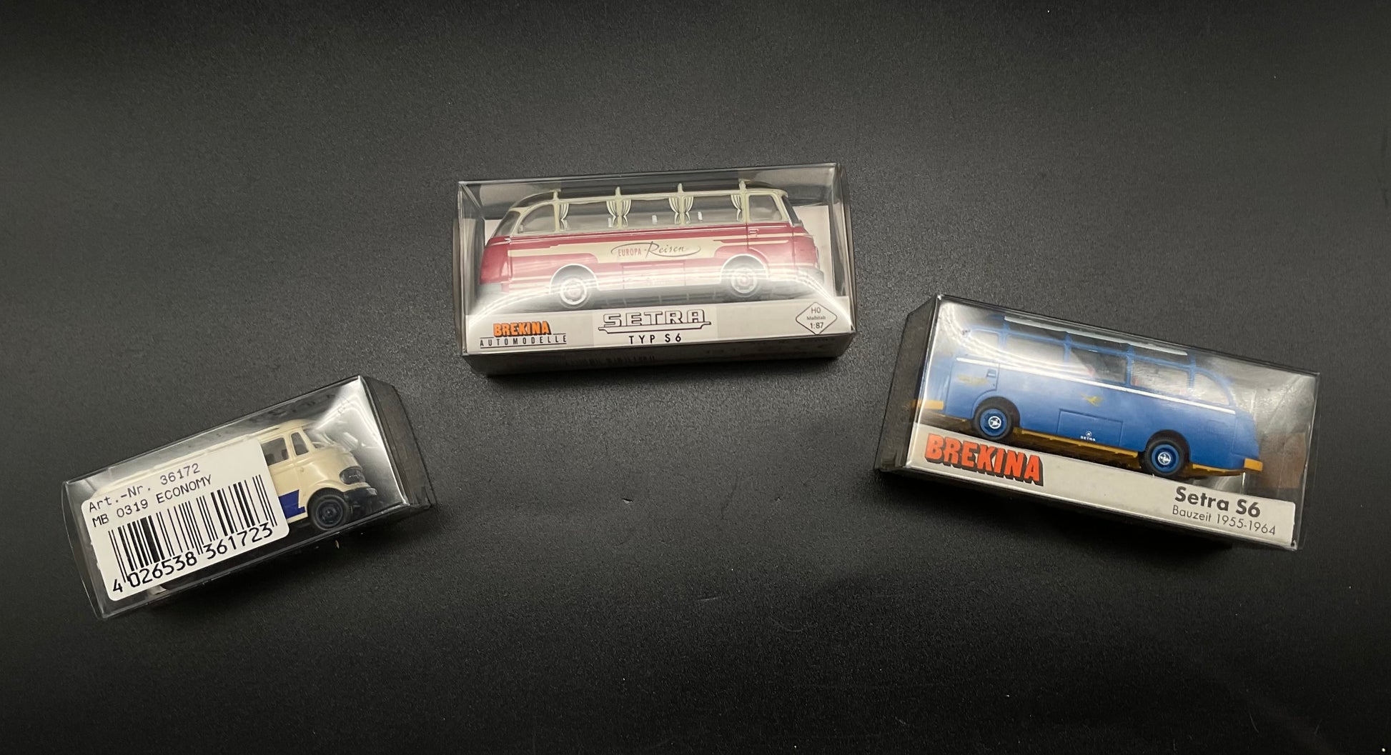 Es handelt sich um drei Brekina Automodelle, einmal um ein Setra Typ S6 in Rot, um ein Setra S6 Modellbus in Blau und um ein weißen Mini Bus. Zustand und Hinweise zu den Modellen siehe Bilder. Die Fahrzeuge sind gebraucht. Die Autos sind Original Modelle von Brekina.