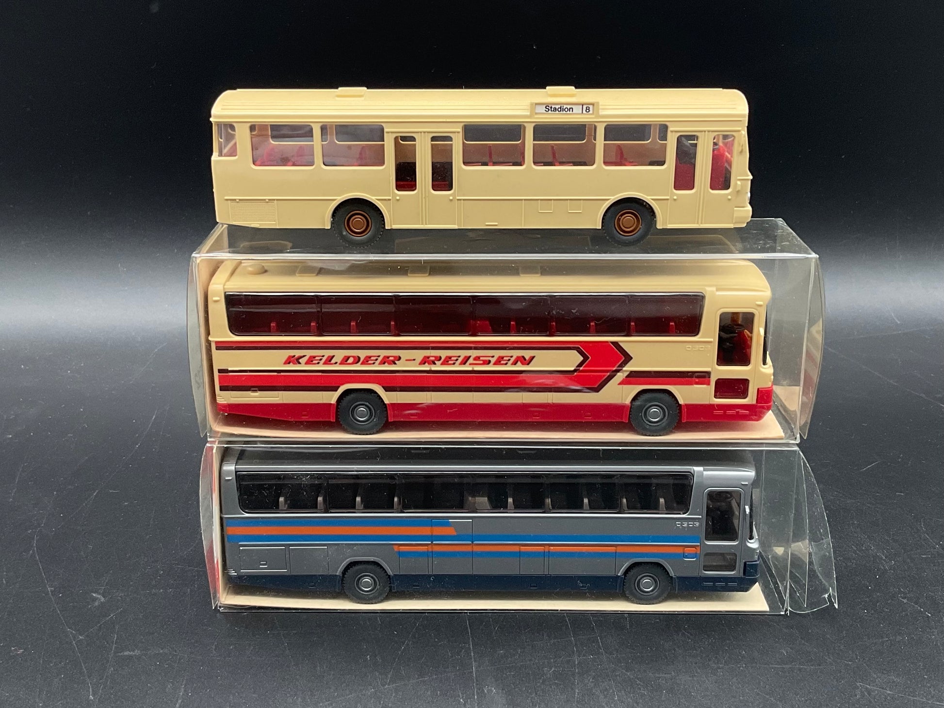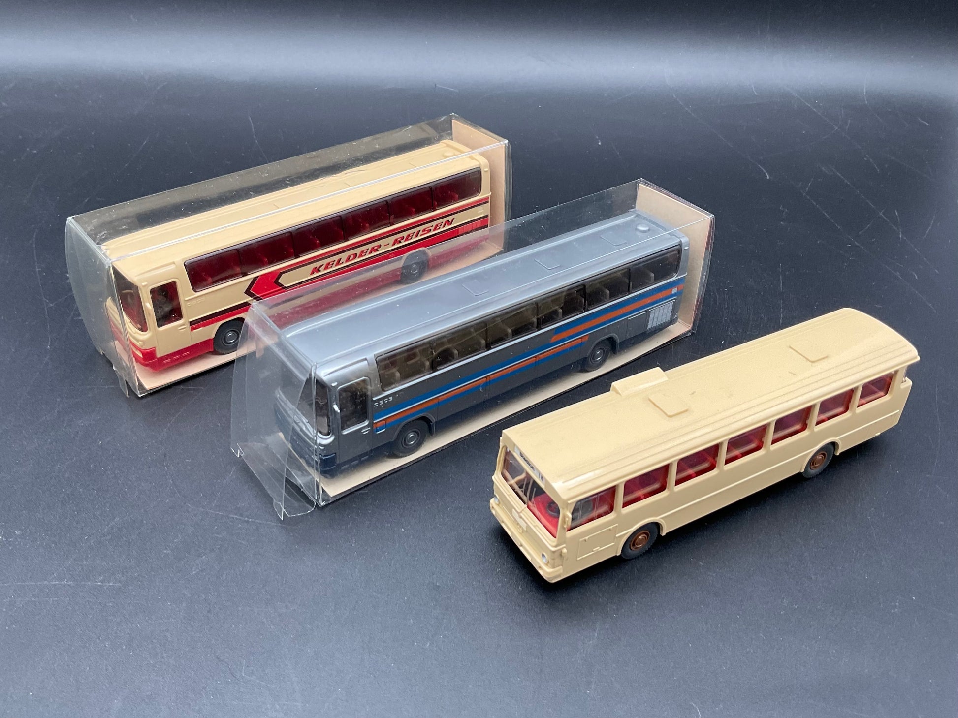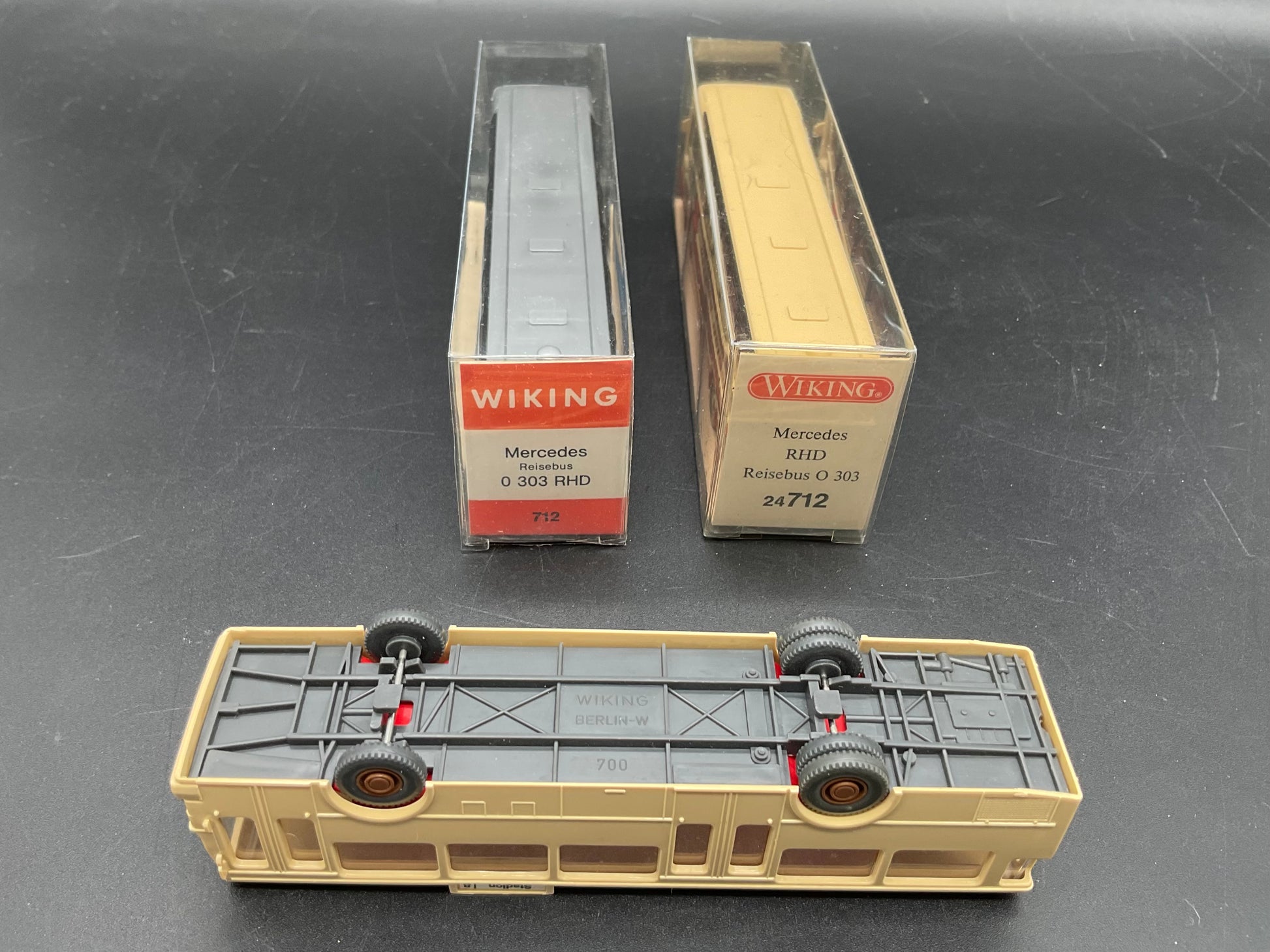 Es handelt sich hierbei um einmal ein Reisebus von Mercedes Benz MB O 303 RHD mit der Modellnummer 712, ein Mercedes Benz Reisebus O 303 RHD mit der Modellnummer 24 712 und einmal ein Reisebus von Mercedes Benz. Das Modellfahrzeugset ist gebraucht und Original von Wiking. Es weist leichte Gebrauchsspuren auf und der Zustand ist entsprechend den Bildern. Zusätzlich dienen die Bilder der Beschreibung.