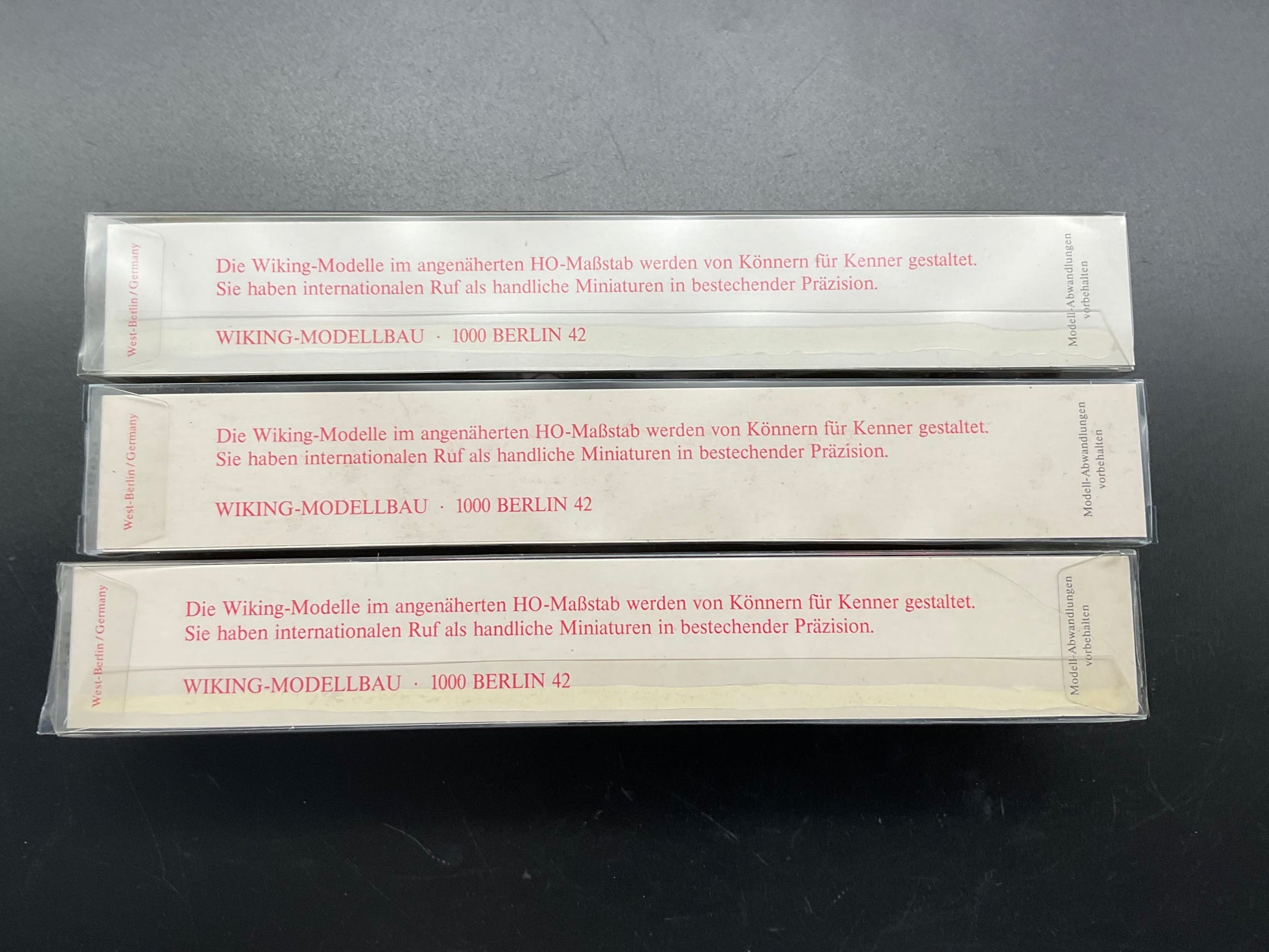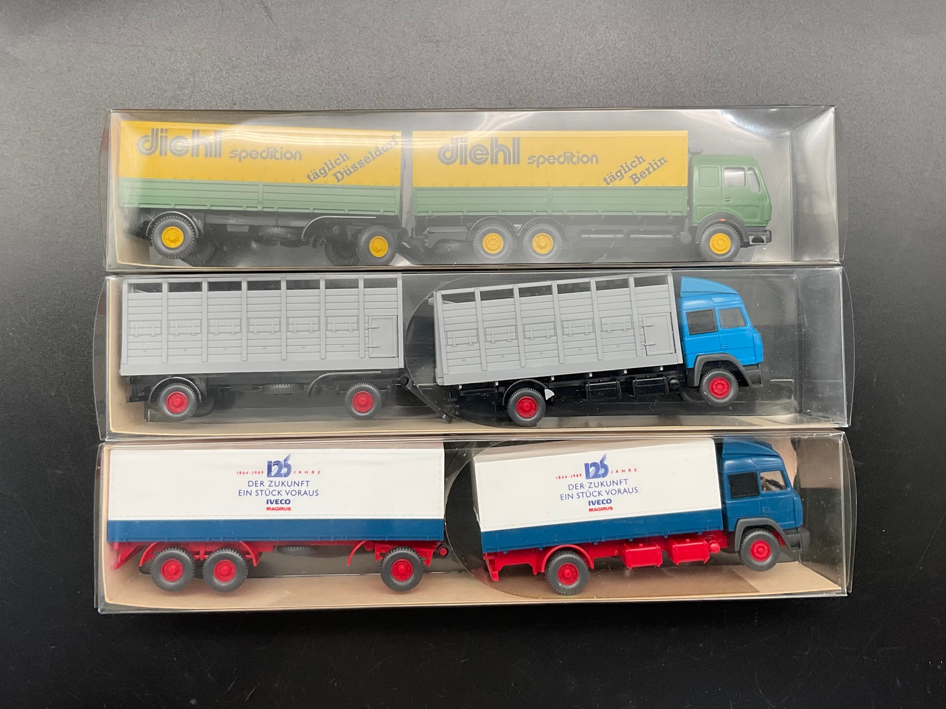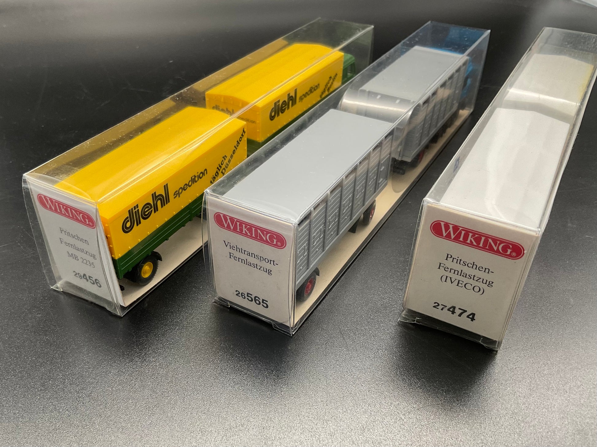 Es handelt sich hierbei um drei Fernlastzüge, einmal ein Pritschenfernlastzug MB 2235 in gelb(29 456), einmal ein Viehtransport-Fernlastzug in grau(26 565) und ein Pritschen-Fernlastzug in weiß (27 474). Die Fahrzeuge sind Original von Wiking und gebraucht. Daher weisen sie Gebrauchsspuren auf. Zustand entsprechend den Bilder und die Bilder dienen der Beschreibung.