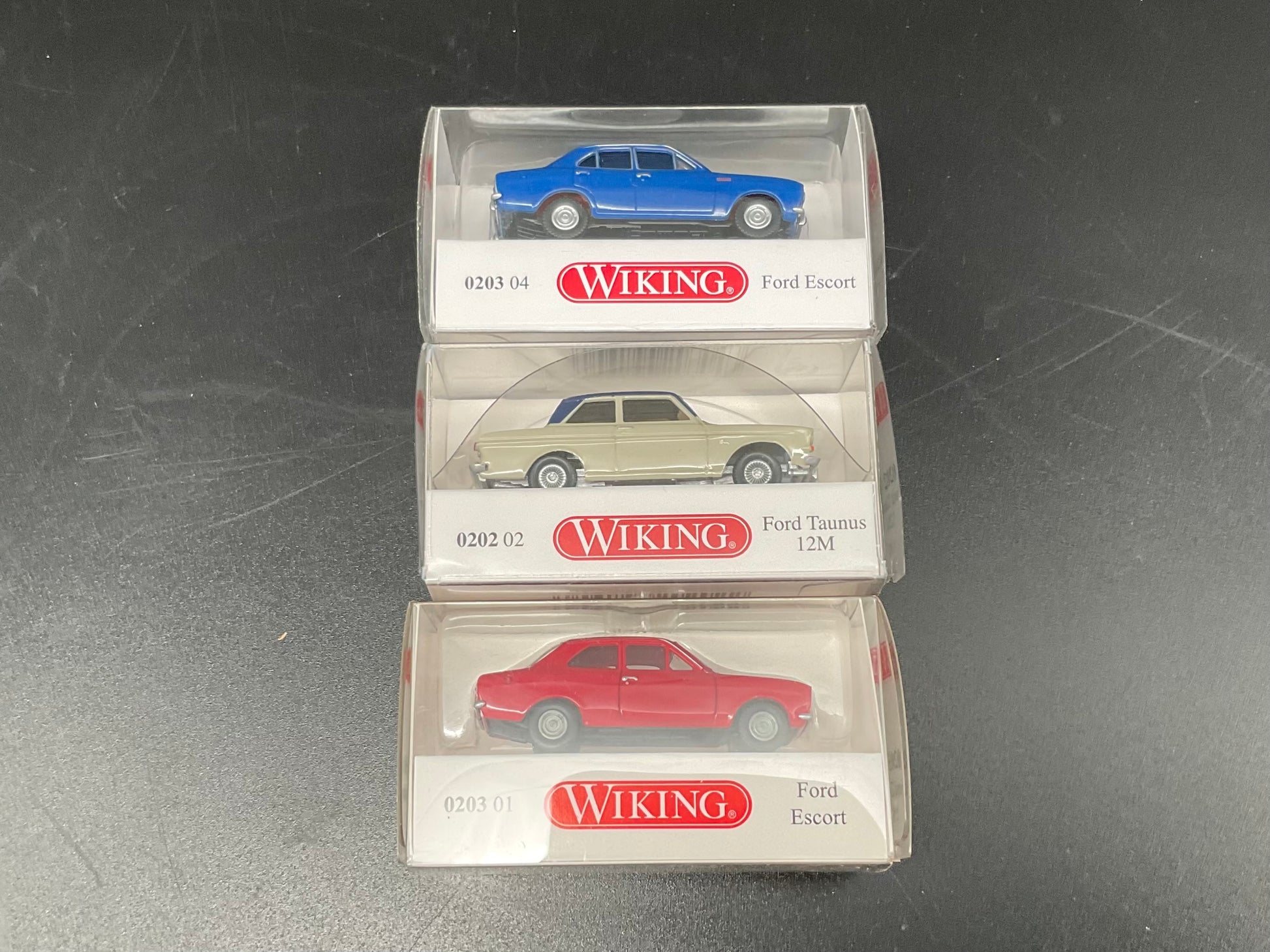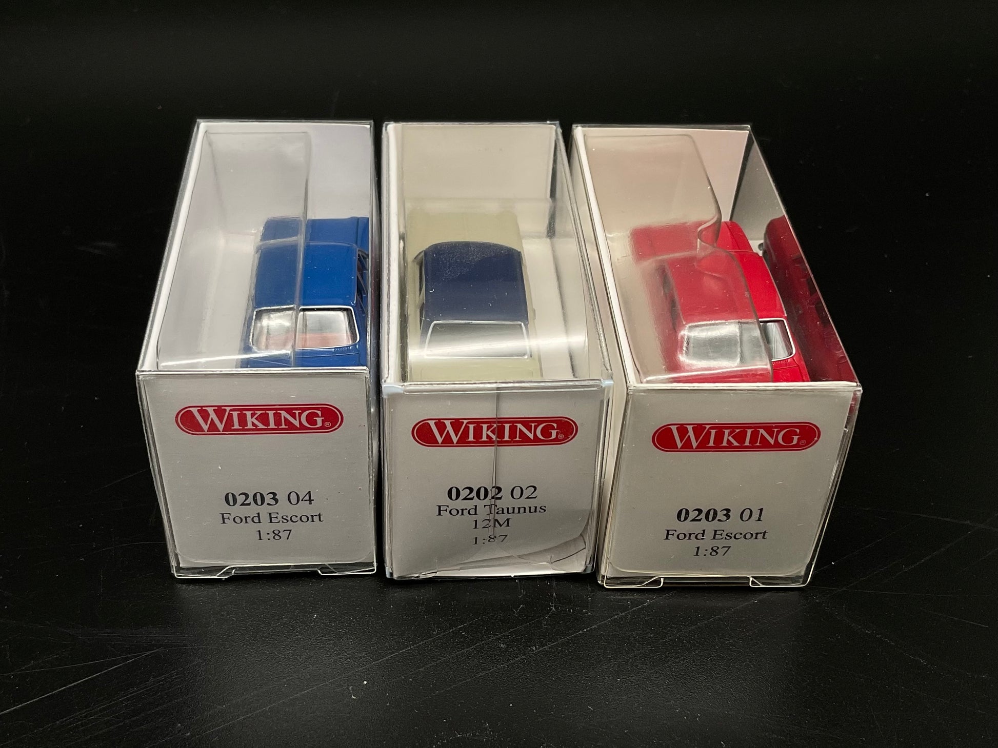 Es handelt sich hierbei um ein Ford Escort mit der Modellnummer 0203 01, ein Ford Escort mit der Modellnummer 0203 04 und ein Ford Taunus 12M mit einer Modellnummer von 0202 02. Das Fahrzeugset ist Original von Wiking und gebraucht. Daher weist es kleine Gebrauchsspuren auf. Zustand entsprechend den Bilder und die Bilder dienen der Beschreibung.