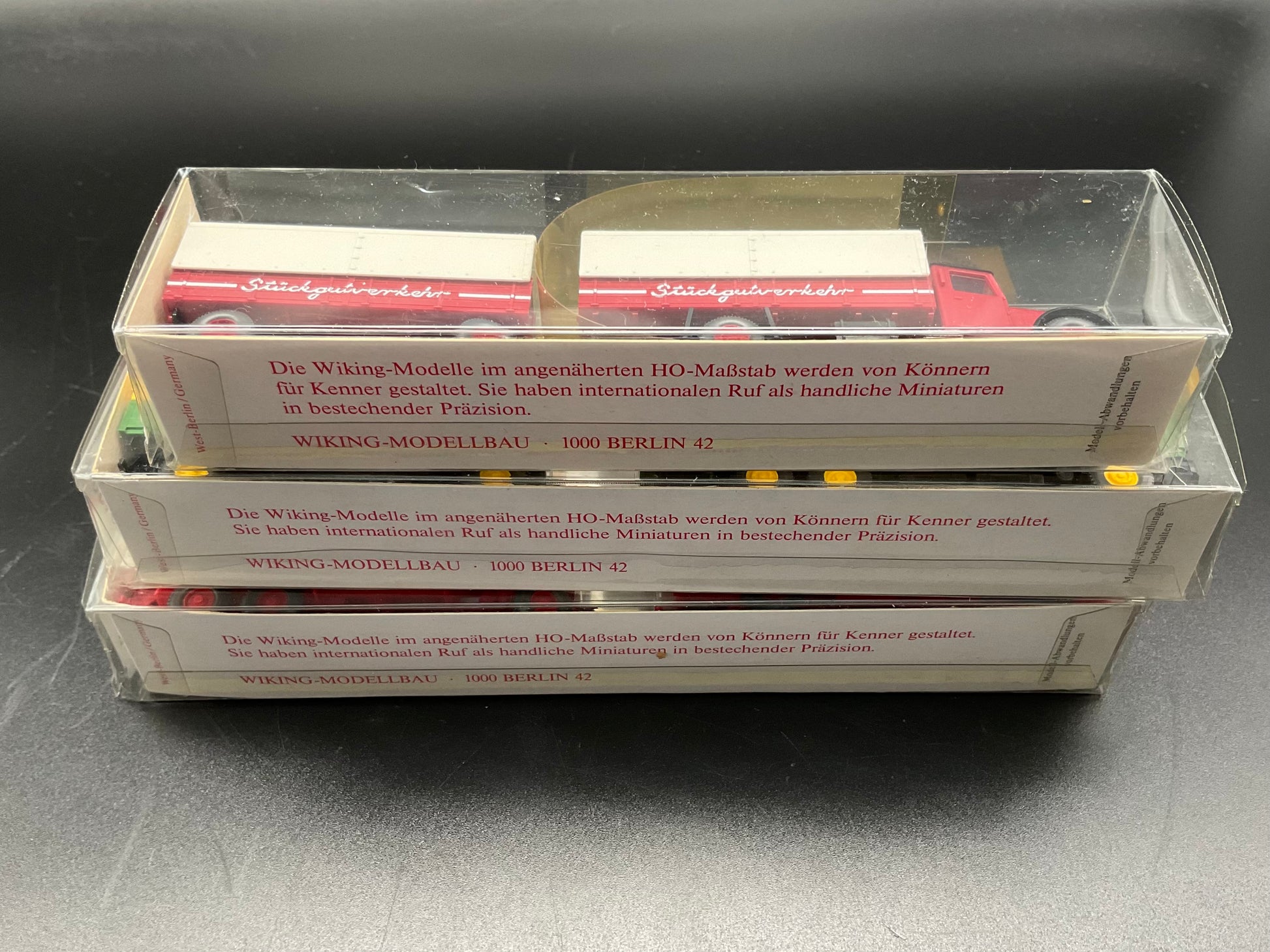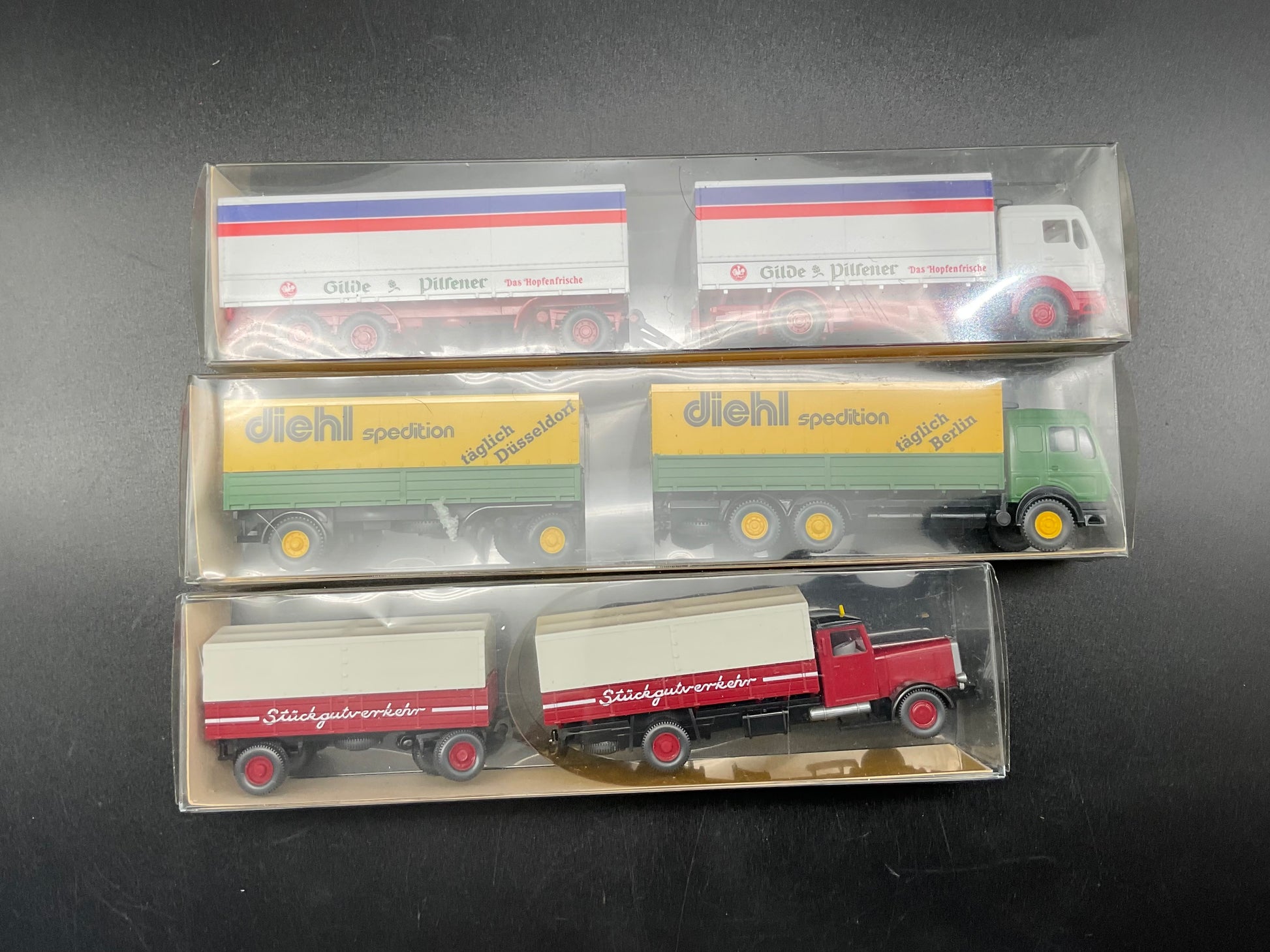 Es handelt sich hierbei um drei Fernlastzüge, einmal ein Pritschenlastzug Hanomag in weiß (857 27), einmal ein Pritschenfernlastzug MB 2235 in gelb (29 456) und ein Fernlastzug MB 1632 in weiß (30 455). Die Fahrzeuge sind Original von Wiking und gebraucht. Daher weisen sie Gebrauchsspuren auf. Zustand entsprechend den Bilder und die Bilder dienen der Beschreibung.