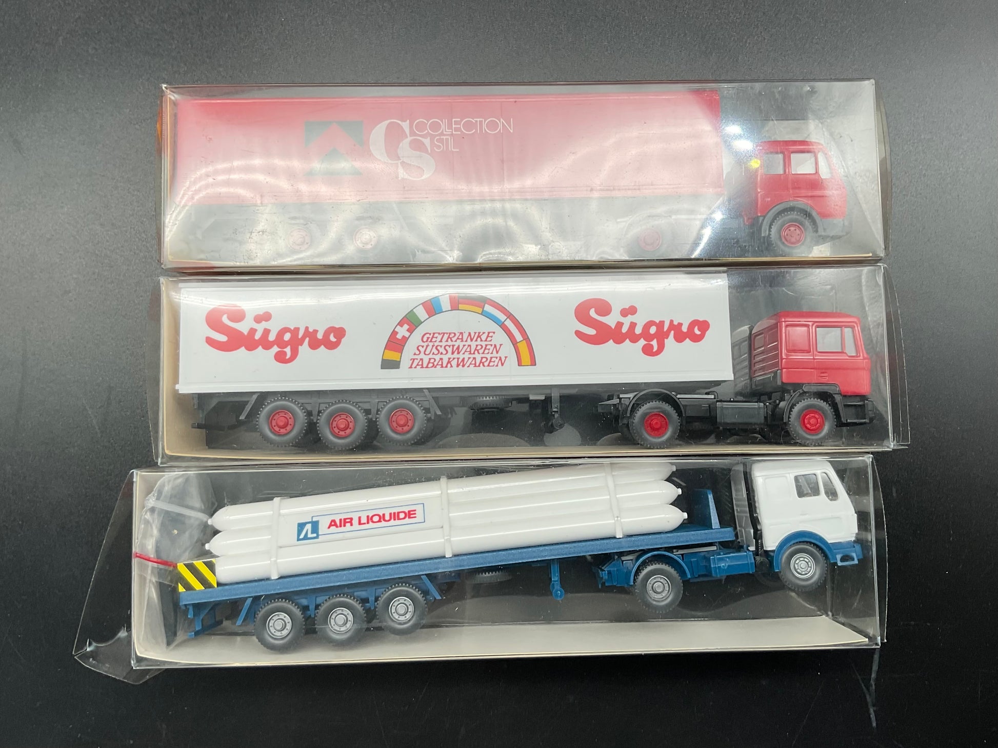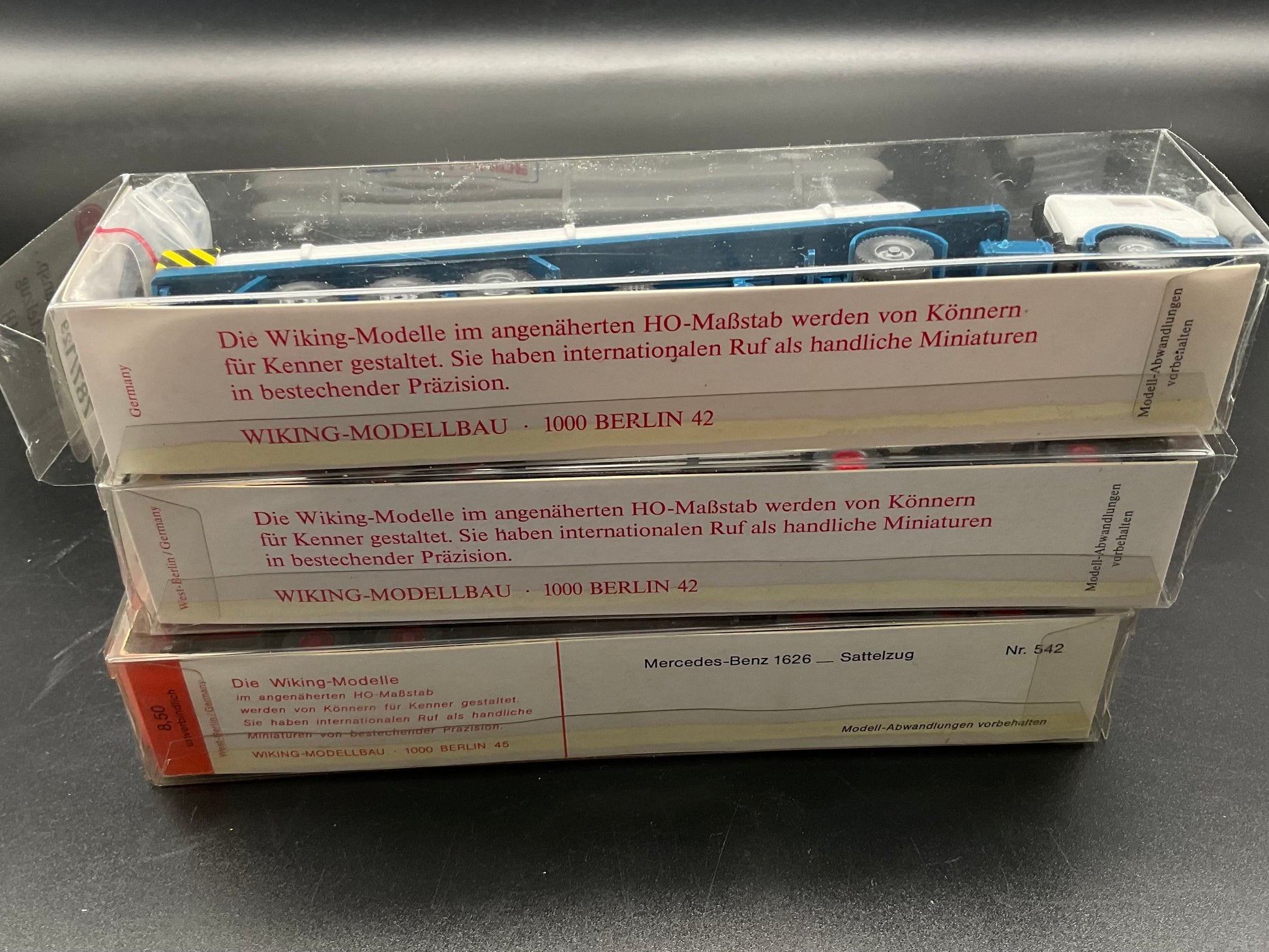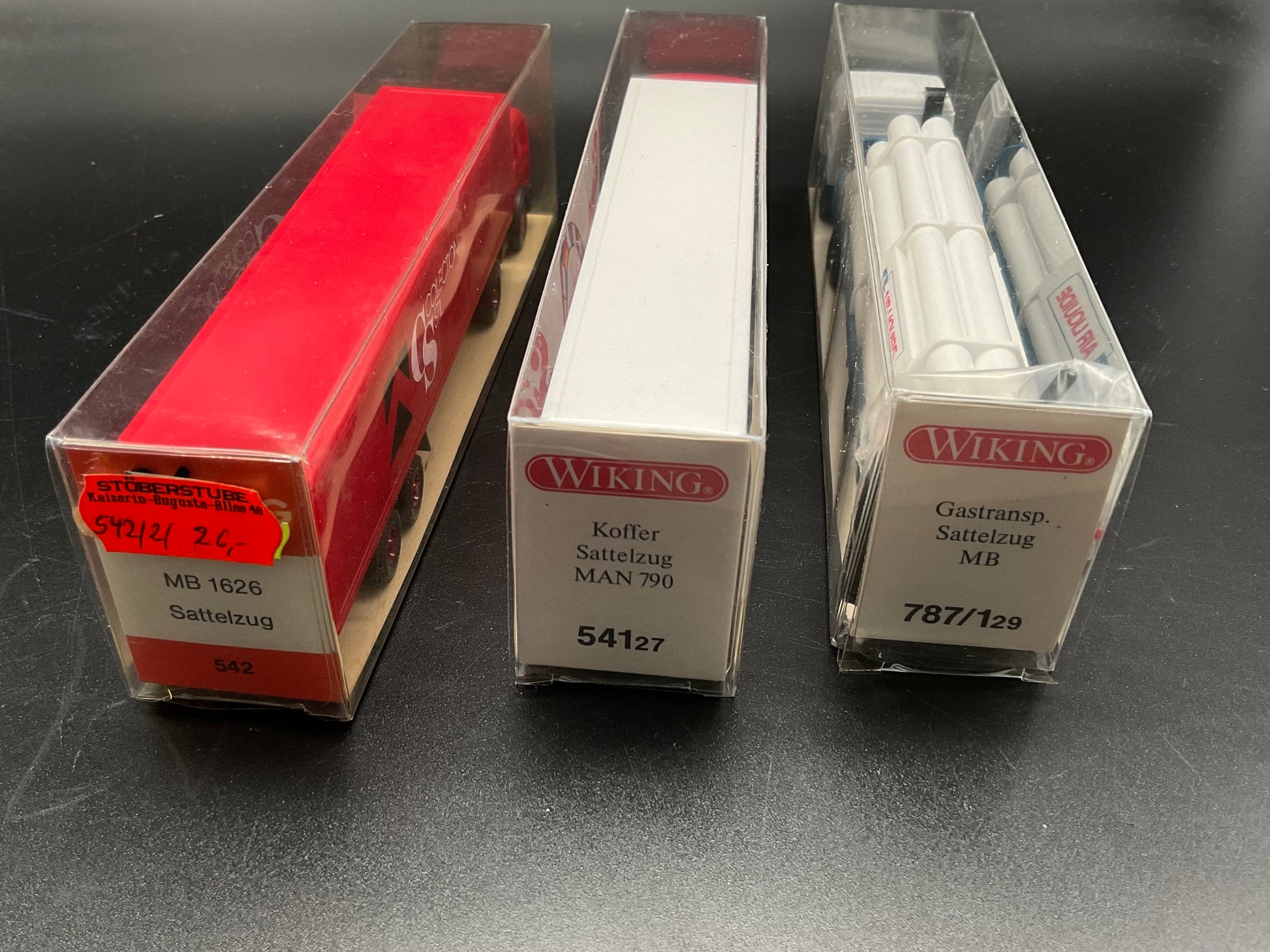 Es handelt sich hierbei um drei Sattelzüge, einmal ein Gastransp.-Sattelzug MB in weiß(787/129), einmal ein Koffer-Sattelzug MAN 790 in weiß(541 27) und ein Sattelzug MB 1626 in rot (542). Die Fahrzeuge sind Original von Wiking und gebraucht. Daher weisen sie Gebrauchsspuren auf. Zustand entsprechend den Bilder und die Bilder dienen der Beschreibung.