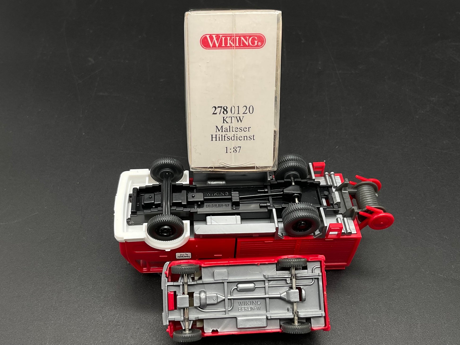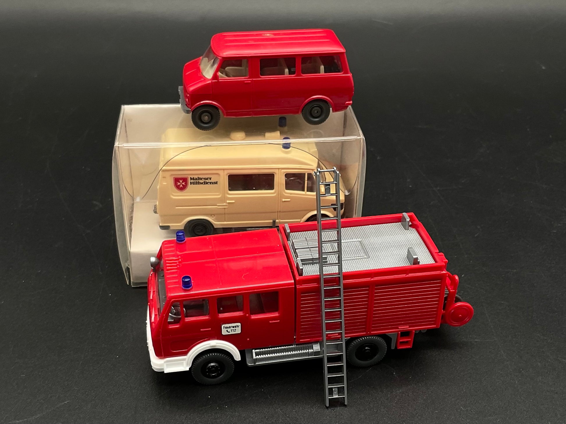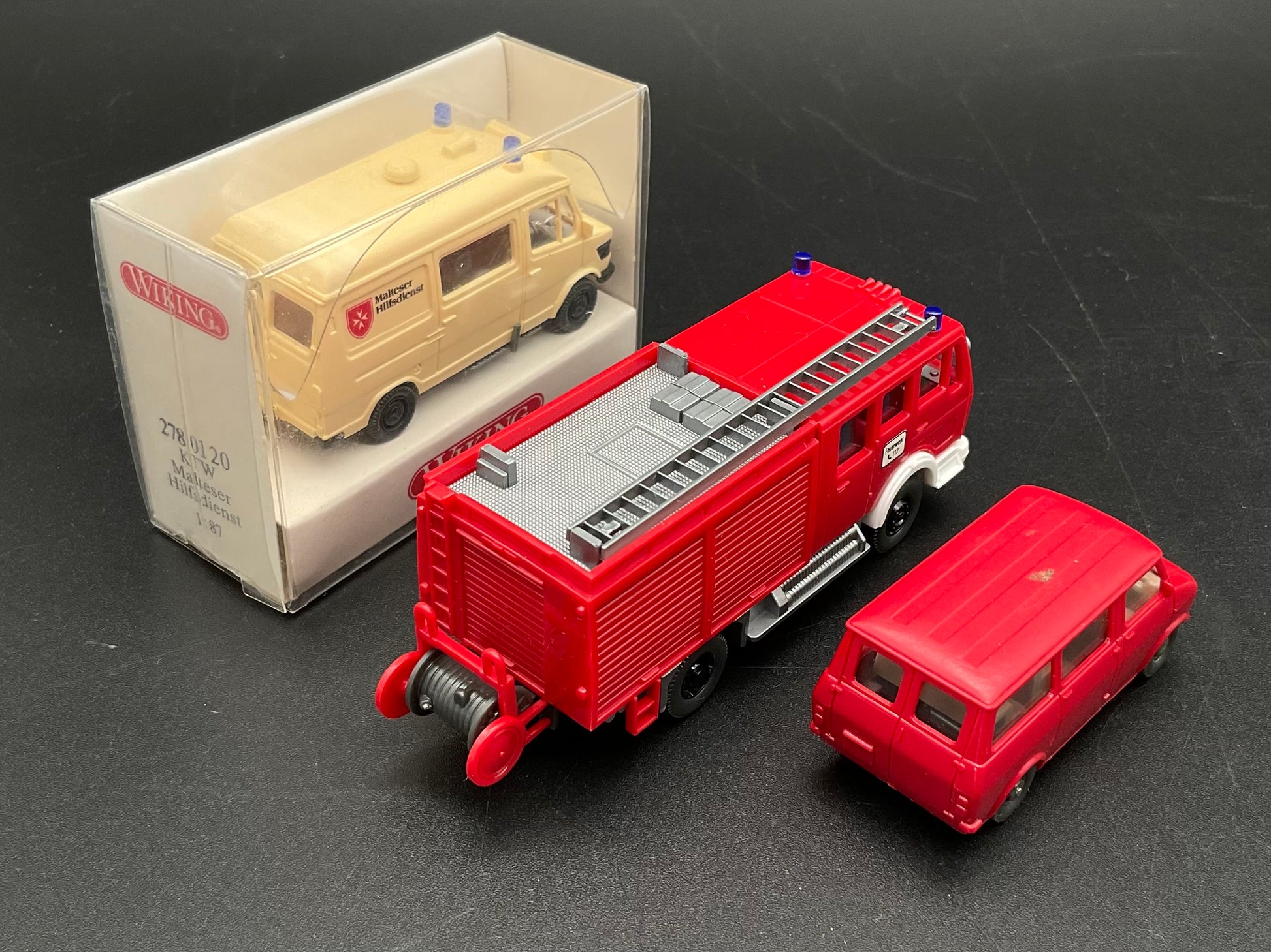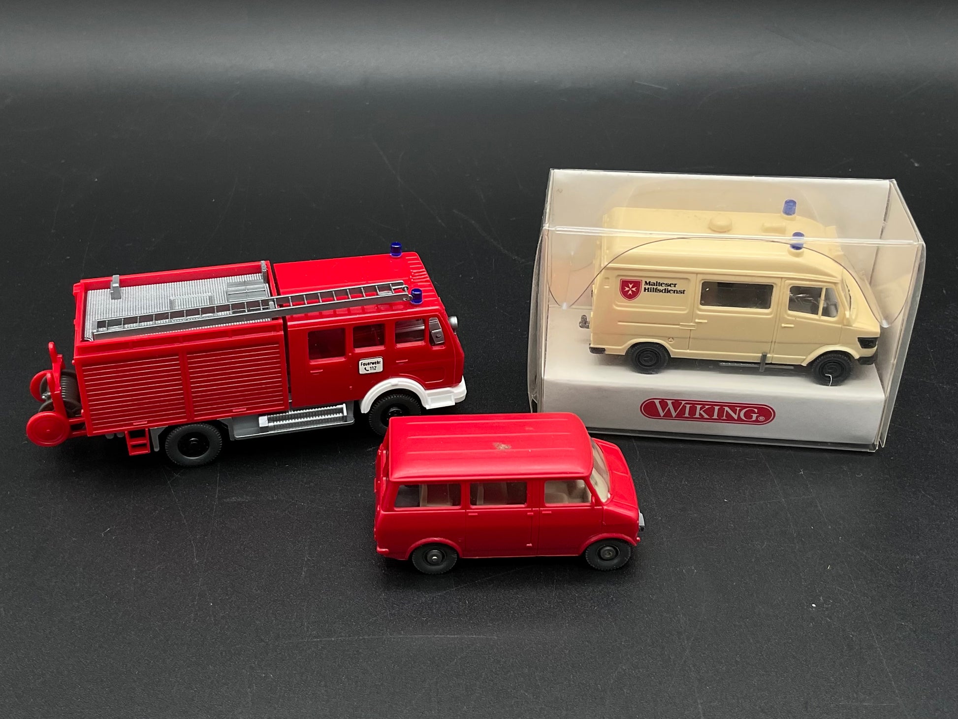 Es handelt sich hierbei um drei Einsatz-Fahrzeuge von Wiking, darunter ein KTW Malteser Hilfsdienst mit der Modellnummer 278 01 20 und ein Feuerwehrauto sowie ein Bulli. Die Fahrzeuge sind Original von Wiking und gebraucht, daher weisen sie kleine Gebrauchsspuren auf. Die Bilder dienen der Beschreibung und der Zustand ist entsprechend den Bildern.