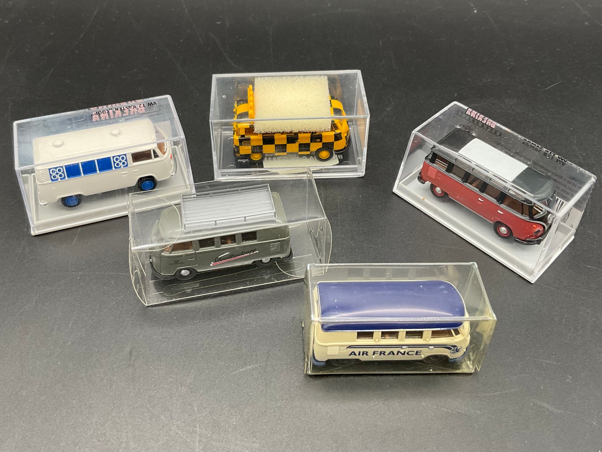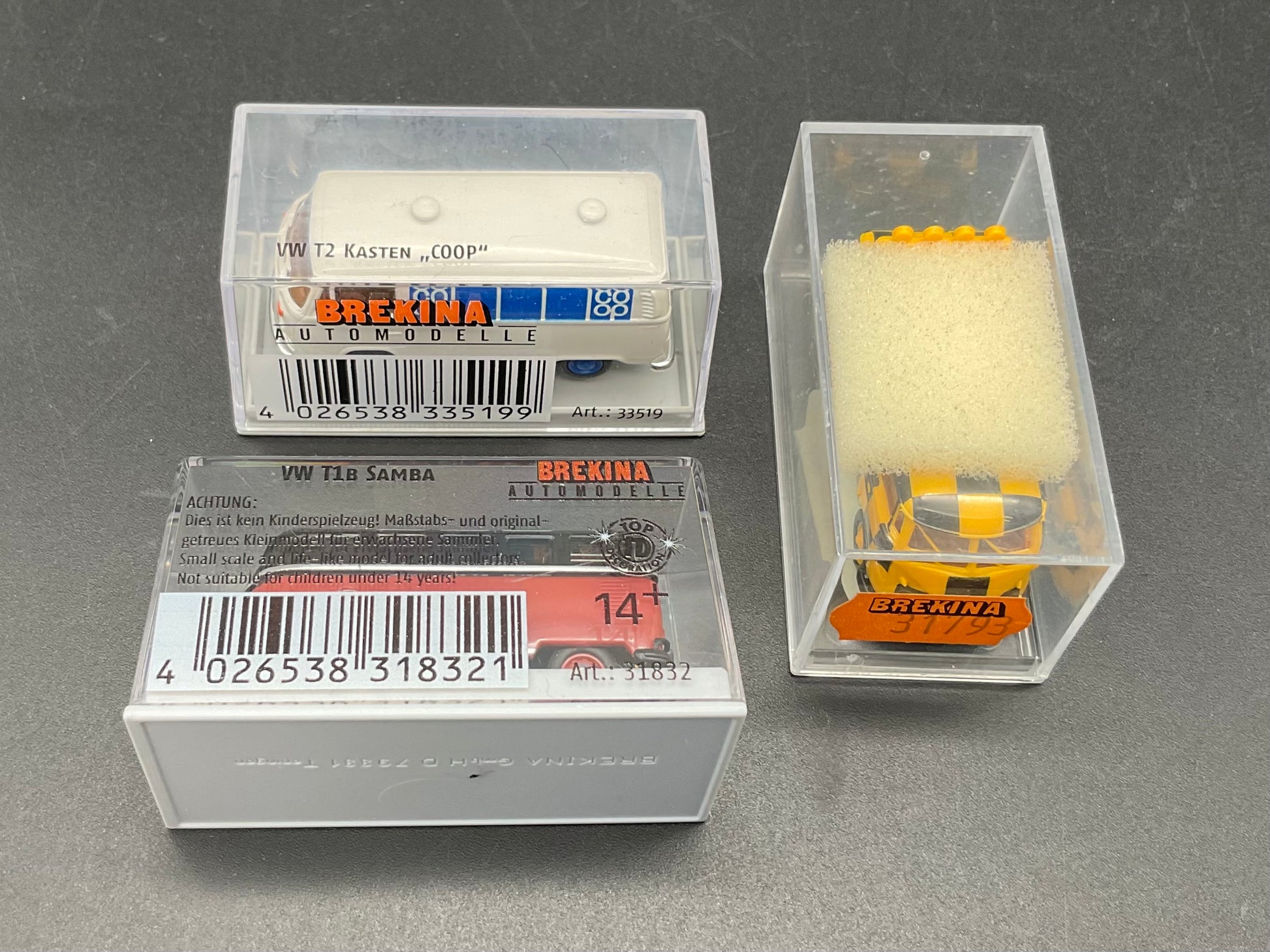 Es handelt sich hierbei um fünf VW Busse darunter: VW T2 Kasten COOP (33519), VW T1 Bus Samba (31832), VW Gelb/schwarzer Bus (31793), VW Air France Bus und ein VW Schnellbautrupp Deutsche Bundespost Bus. Das Modellfahrzeugset ist gebraucht und Original von Brekina. Es weist leichte Gebrauchsspuren auf und der Zustand ist entsprechend den Bildern. Zusätzlich dienen die Bilder der Beschreibung.