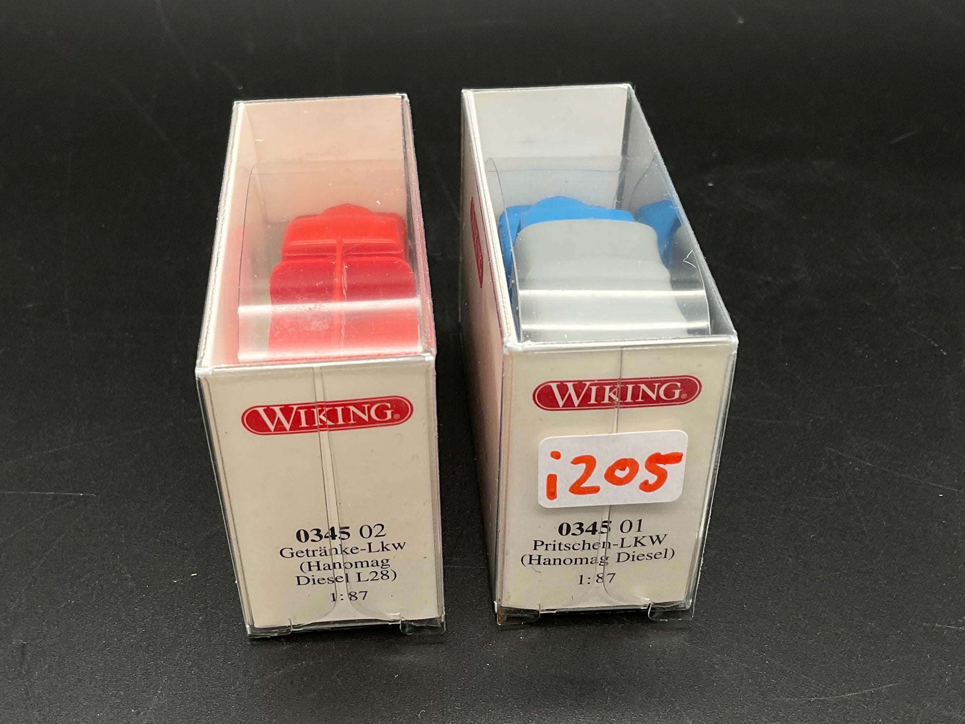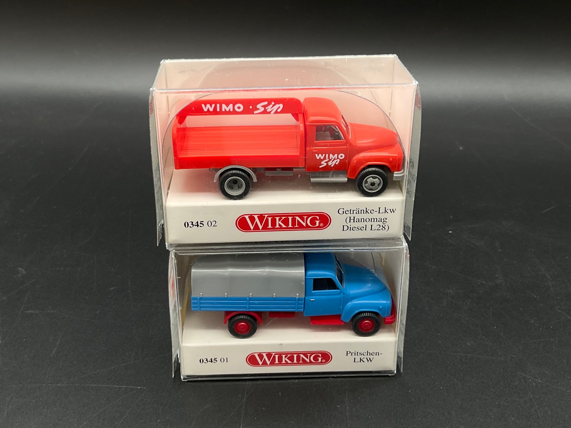 Es handelt sich hierbei um ein Getränke-LKW mit der Modellnummer 0345 02 und um ein Pritschen-LKW mit der Modellnummer 0345 01. Das Fahrzeugset ist Original von Wiking und gebraucht. Daher weist es kleine Gebrauchsspuren auf. Zustand entsprechend den Bilder und die Bilder dienen der Beschreibung.