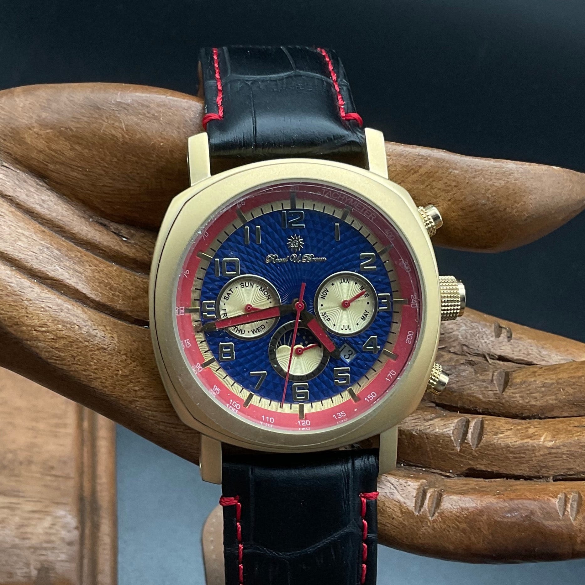 Die Uhr ist Gold und hat ein schwarzes Leder Armband. Sie wiegt 97,5 Gramm und hat auf der vorder- sowie Rückseite noch Folie. Die Uhr ist gebraucht und ihre Funktionsfähigkeit wurde nicht geprüft . Die Bilder dienen der Beschreibung.