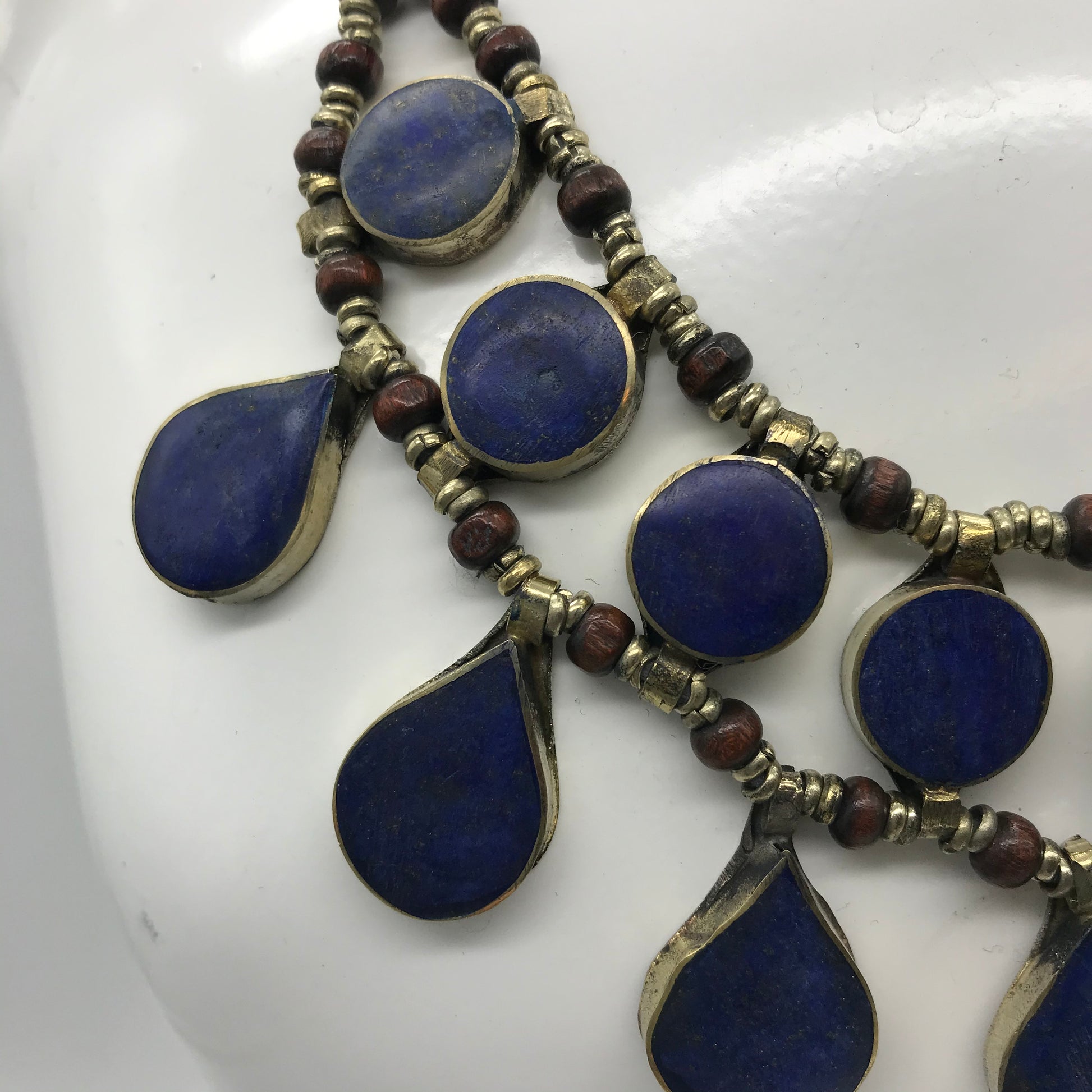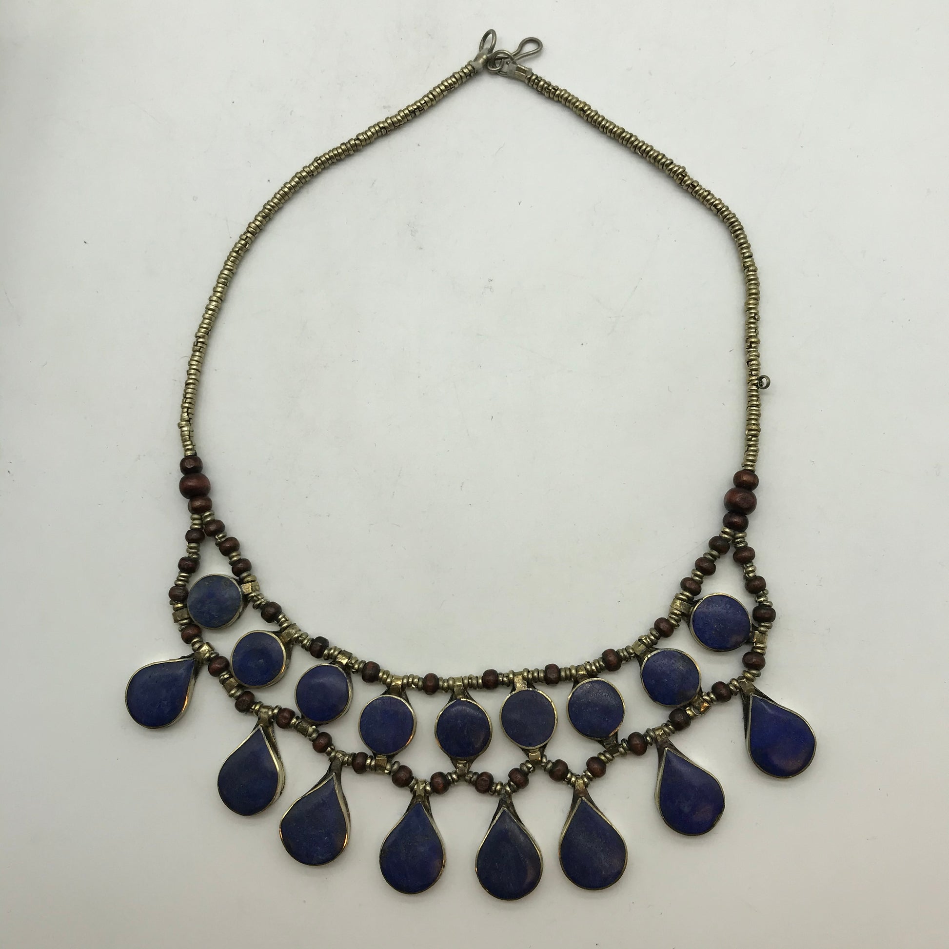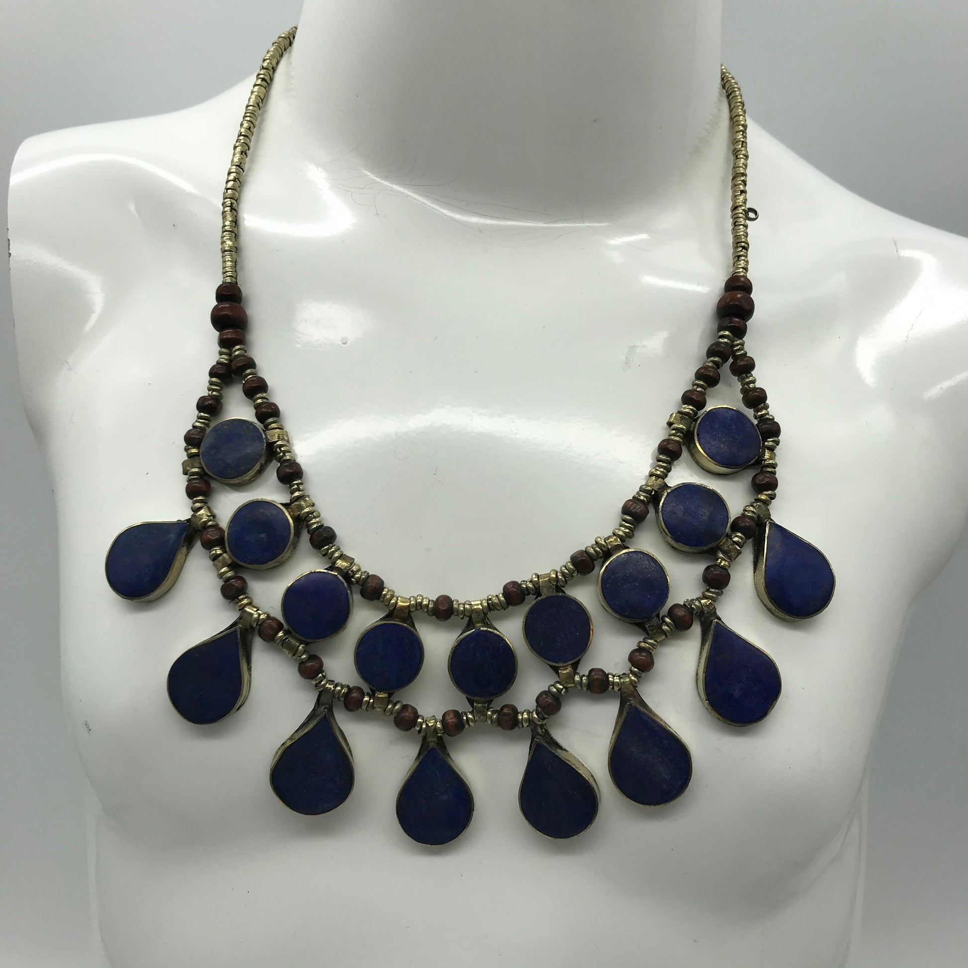 Statement Kette, Modeschmuck, königsblau, silber und rotfarbend, Tropfenform