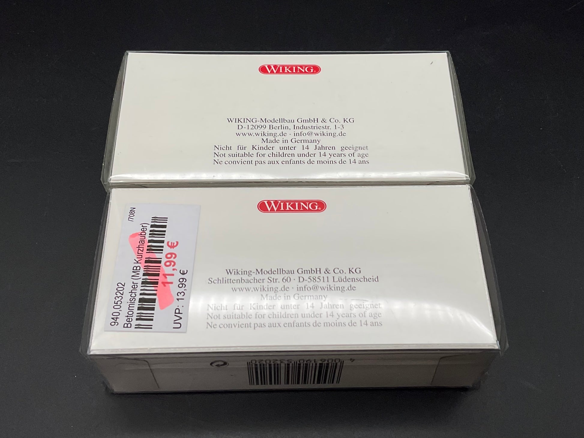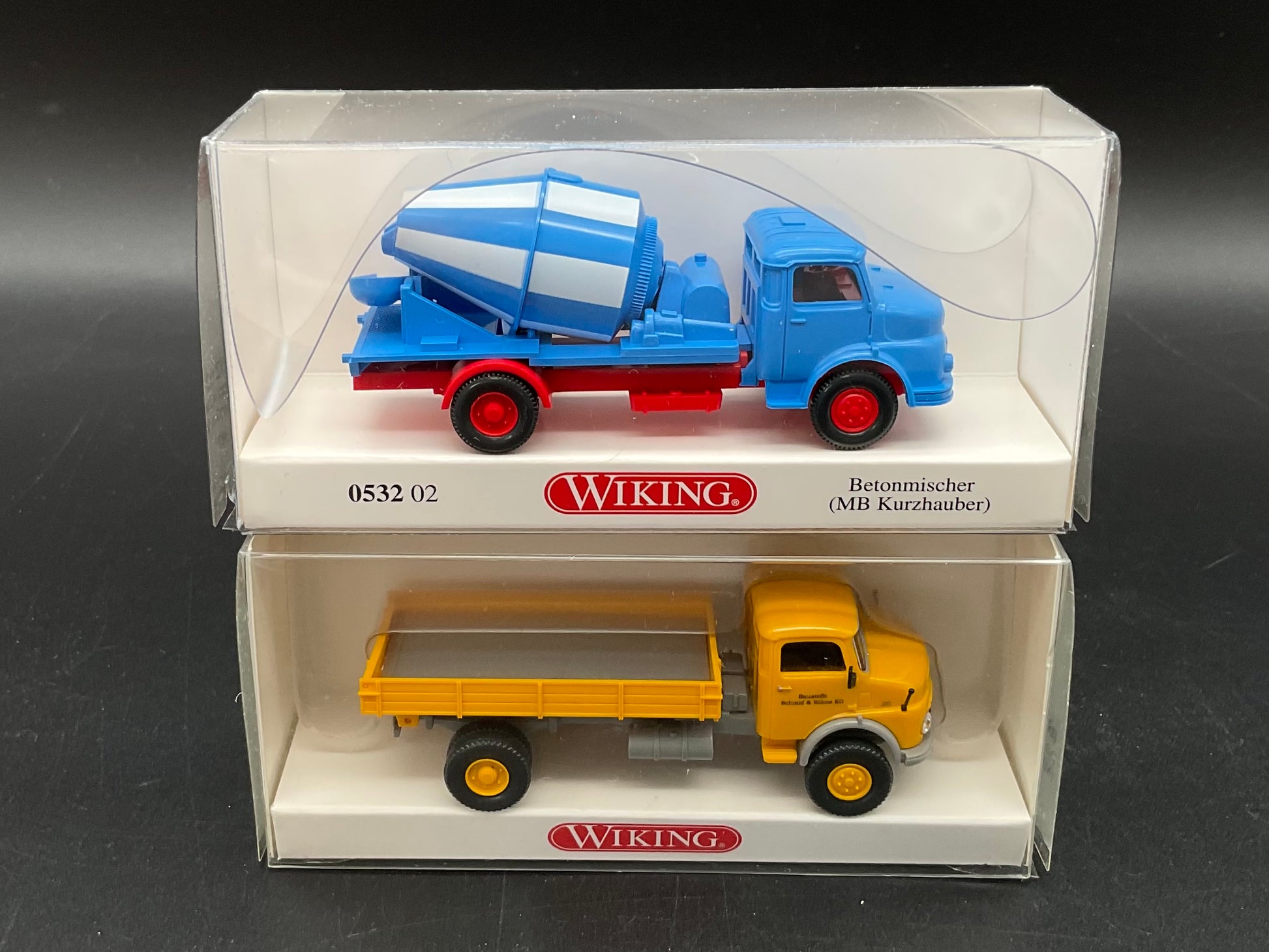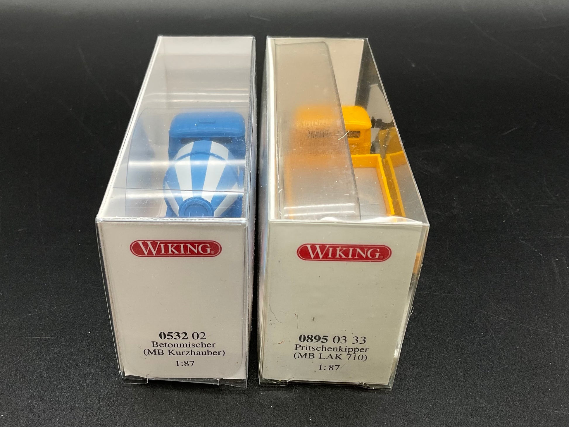 Es handelt sich hierbei um ein Pritschenkipper mit der Modellnummer 0895 03 33 und um ein Betonmischer mit der Modellnummer 0532 02. Das Fahrzeugset ist Original von Wiking und gebraucht. Daher weist es kleine Gebrauchsspuren auf. Zustand entsprechend den Bilder und die Bilder dienen der Beschreibung.