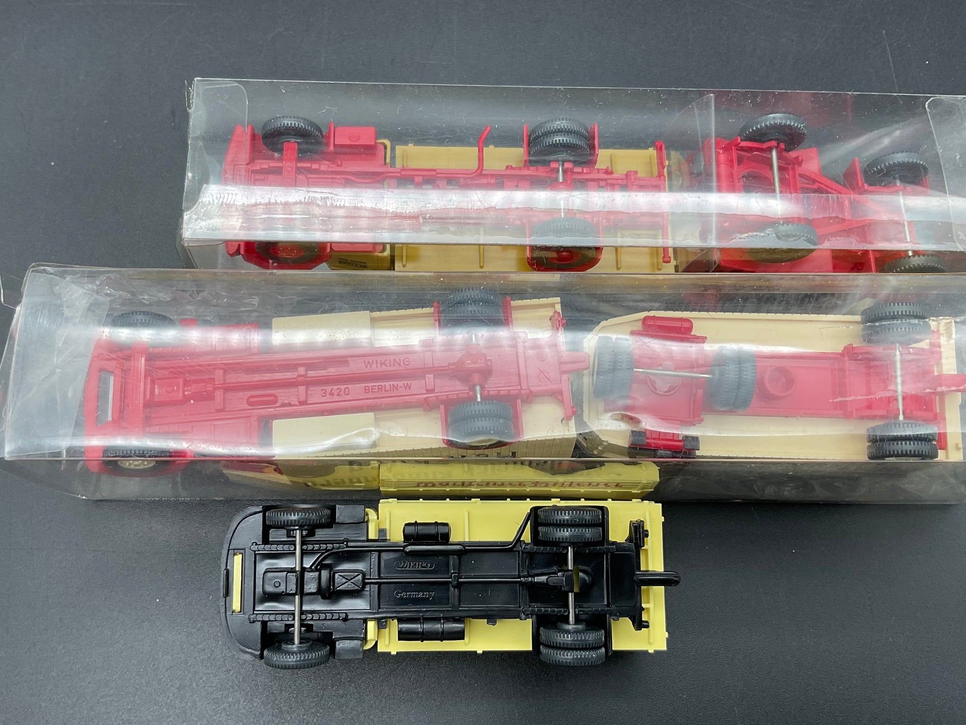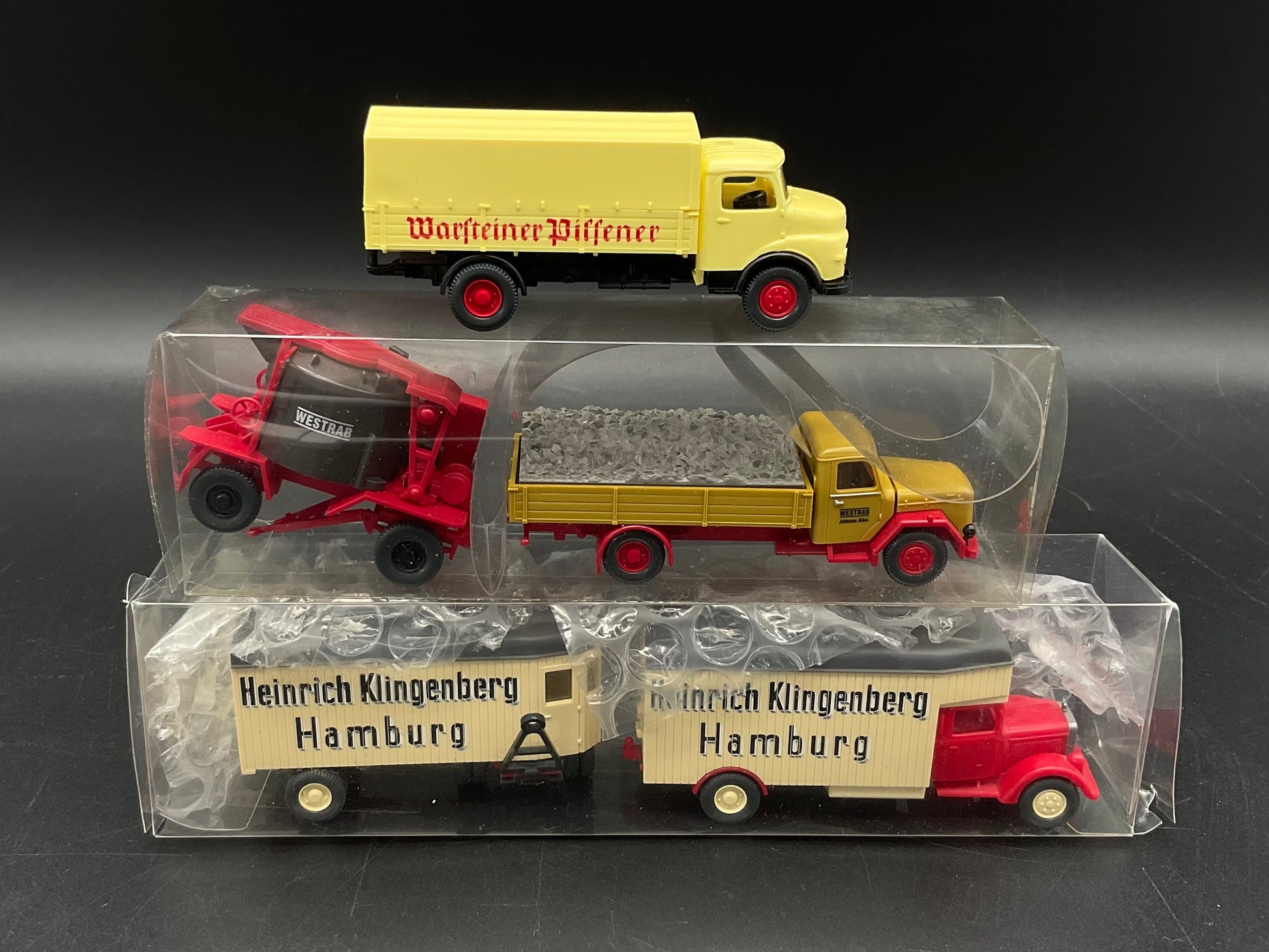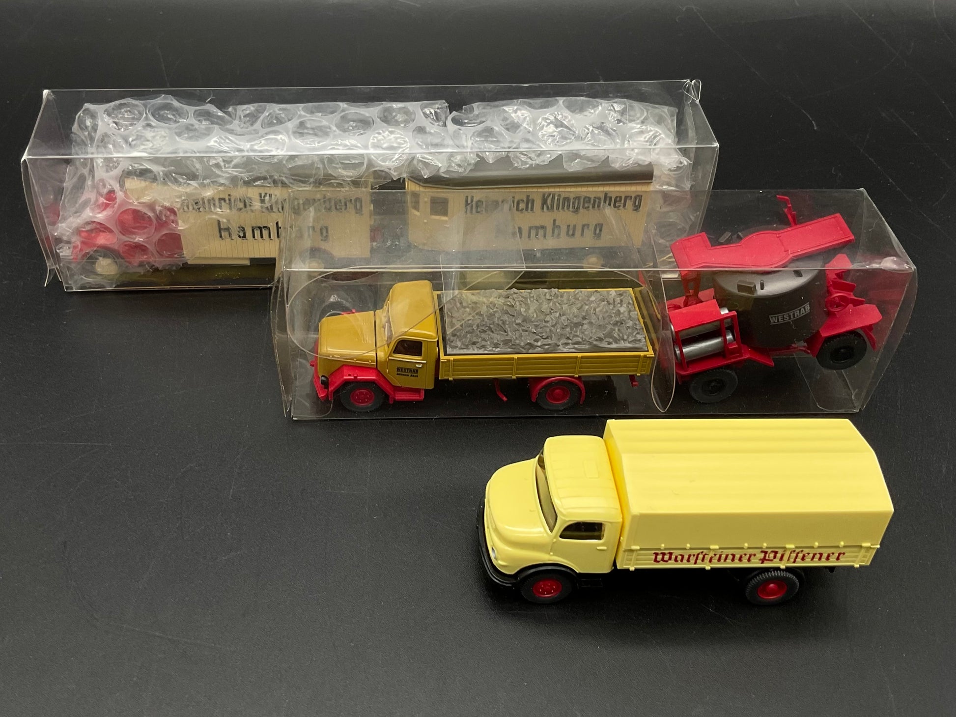 Es handelt sich hierbei um ein LKW von Heinrich Klingenberg Hamburg und zwei Pritschenwagen von Warsteiner Pilsener und von Westrab. Die Modelle sind Original von Wiking und gebraucht, daher weisen sie leichte Gebrauchsspuren auf. Zustand entsprechend den Bildern und die Bilder dienen der Beschreibung.