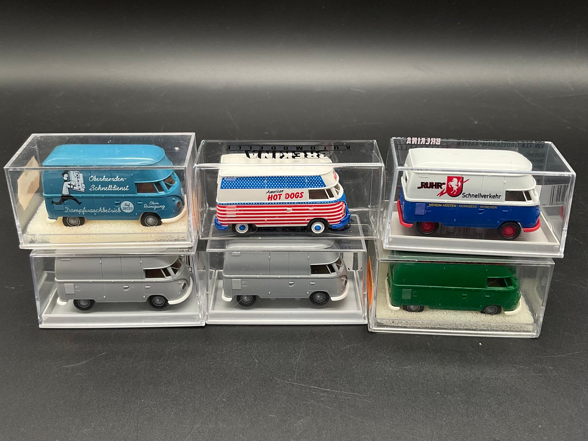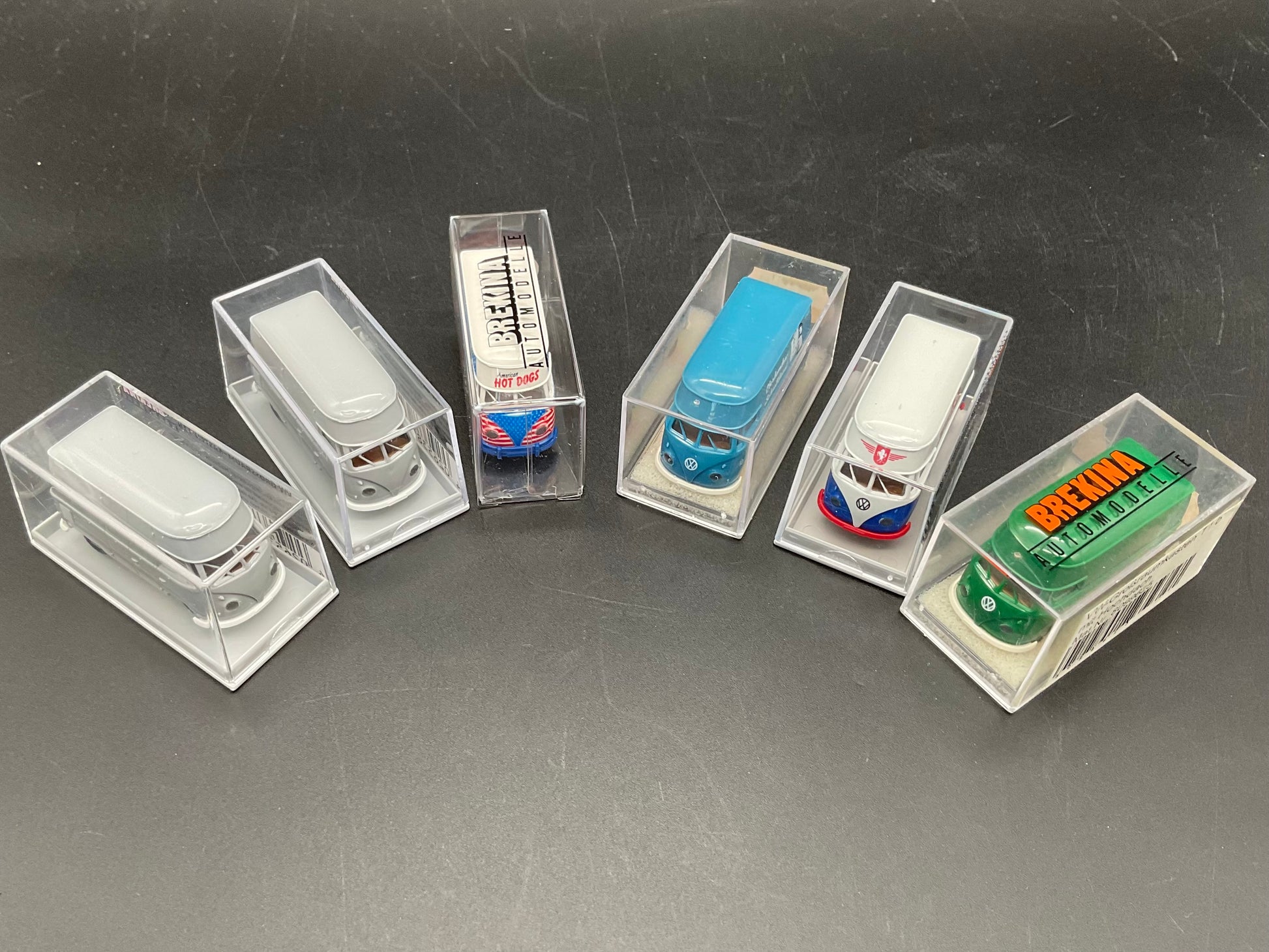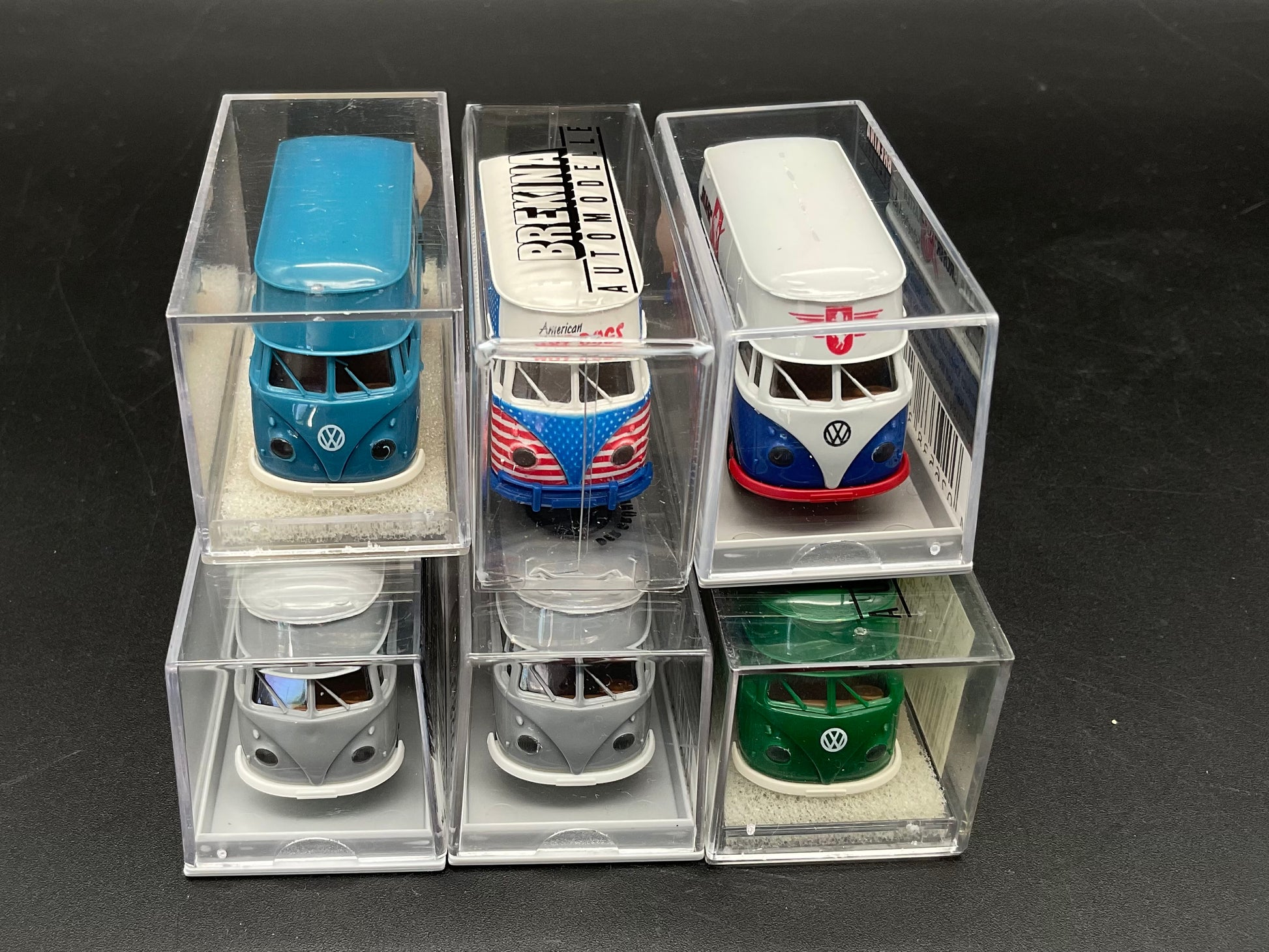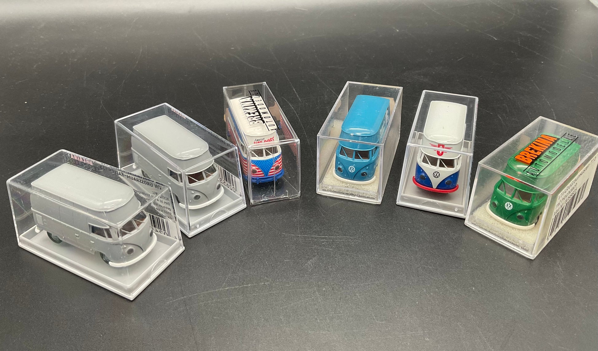 Sechs VW-Großraumkasten Busse von Brekina