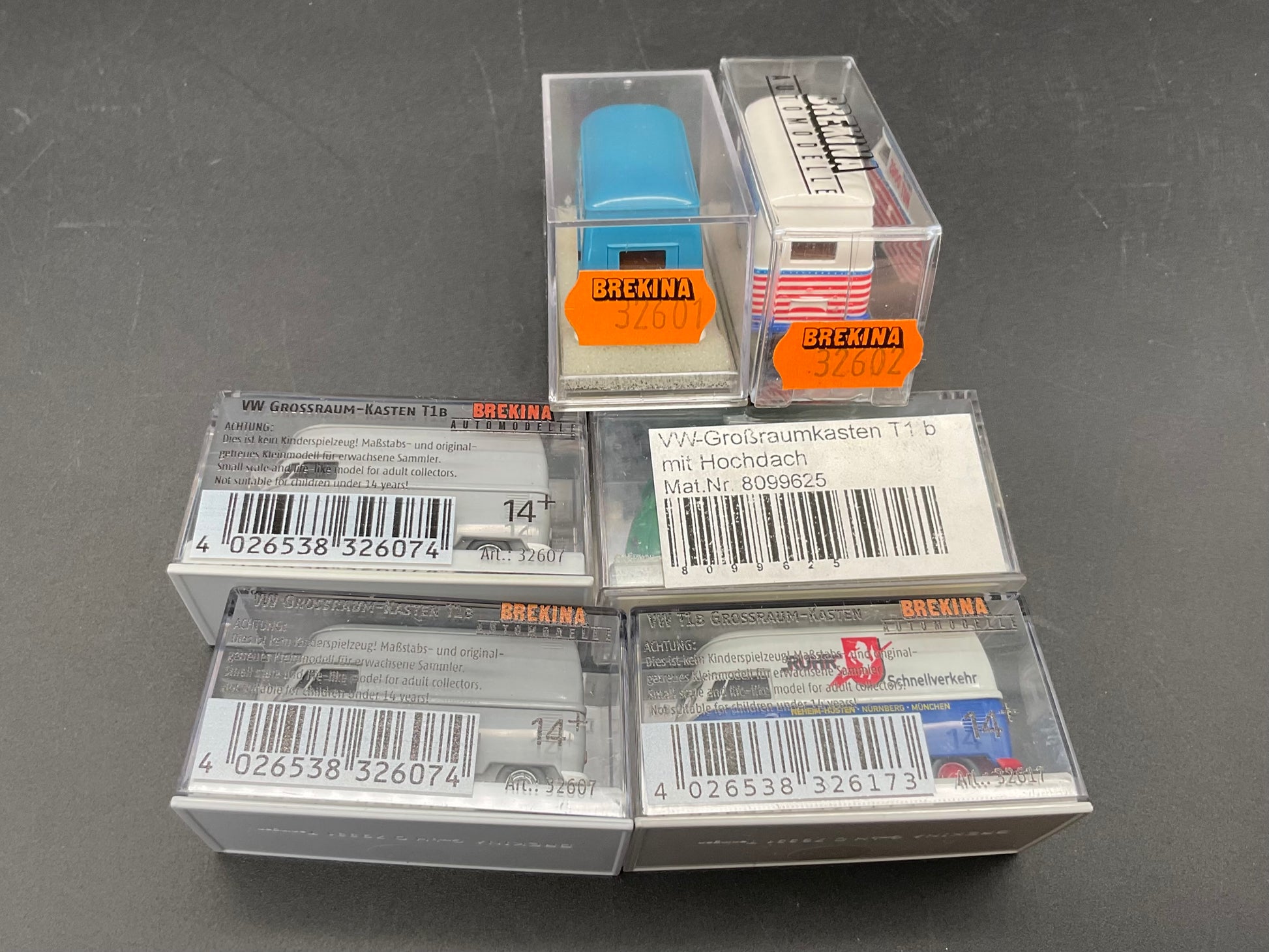 Es handelt sich hierbei um sechs VW Großraumkasten Busse darunter: VW-Großraumkasten T1 Bus mit Hochdach (32600), VW-Großraumkastenwagen (32601), VW T1 Bus Großraumkasten (32617), zwei VW Großraum-Kasten T1 Busse (32607) und ein blauer VW Hot Dogs-Wagen (32602). Das Modellfahrzeugset ist gebraucht und Original von Brekina. Es weist leichte Gebrauchsspuren auf und der Zustand ist entsprechend den Bildern. Zusätzlich dienen die Bilder der Beschreibung.