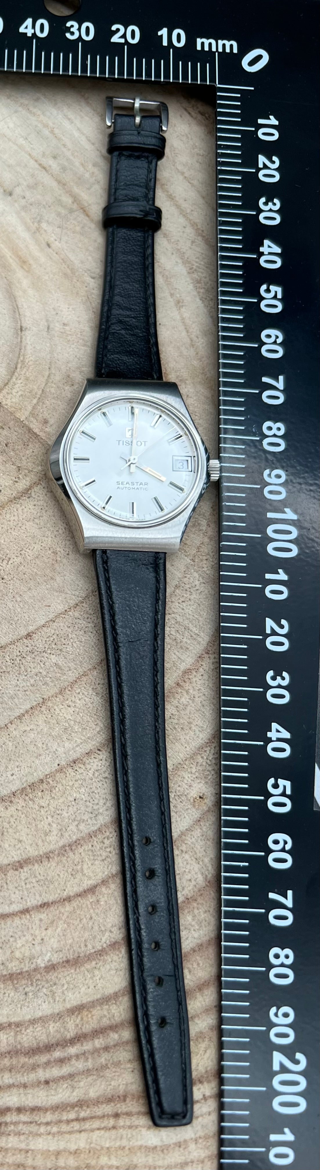Wir verkaufen im Auftrag aus einen Nachlass eine Trissot Seastar Automatic Armbanduhr. Sie hat ein silbernes Gehäuse mit einem hellen Ziffernfeld und schwarzem Lederarmband. Sie ist gebraucht und nicht auf Funktionsfähigkeit geprüft.