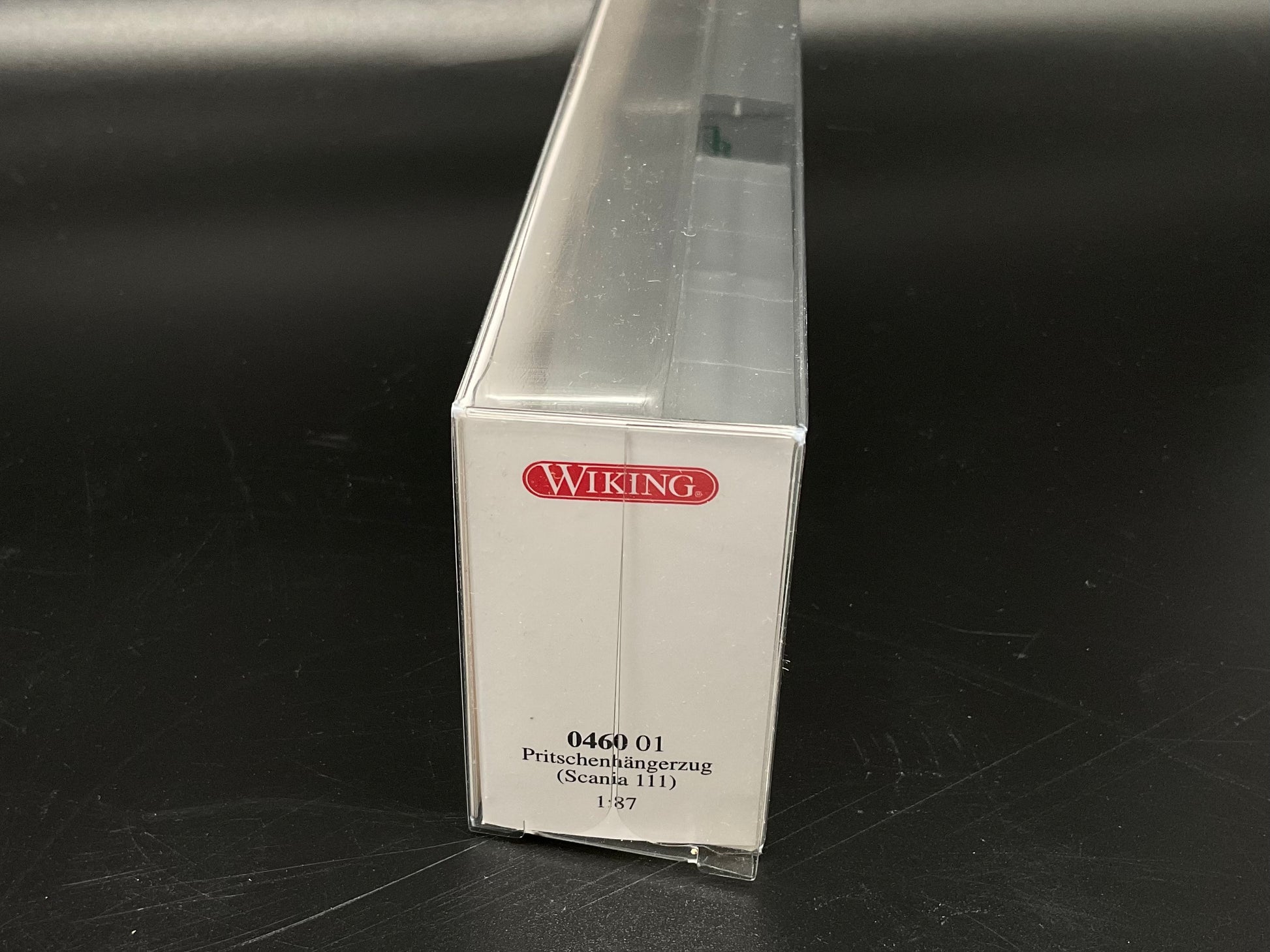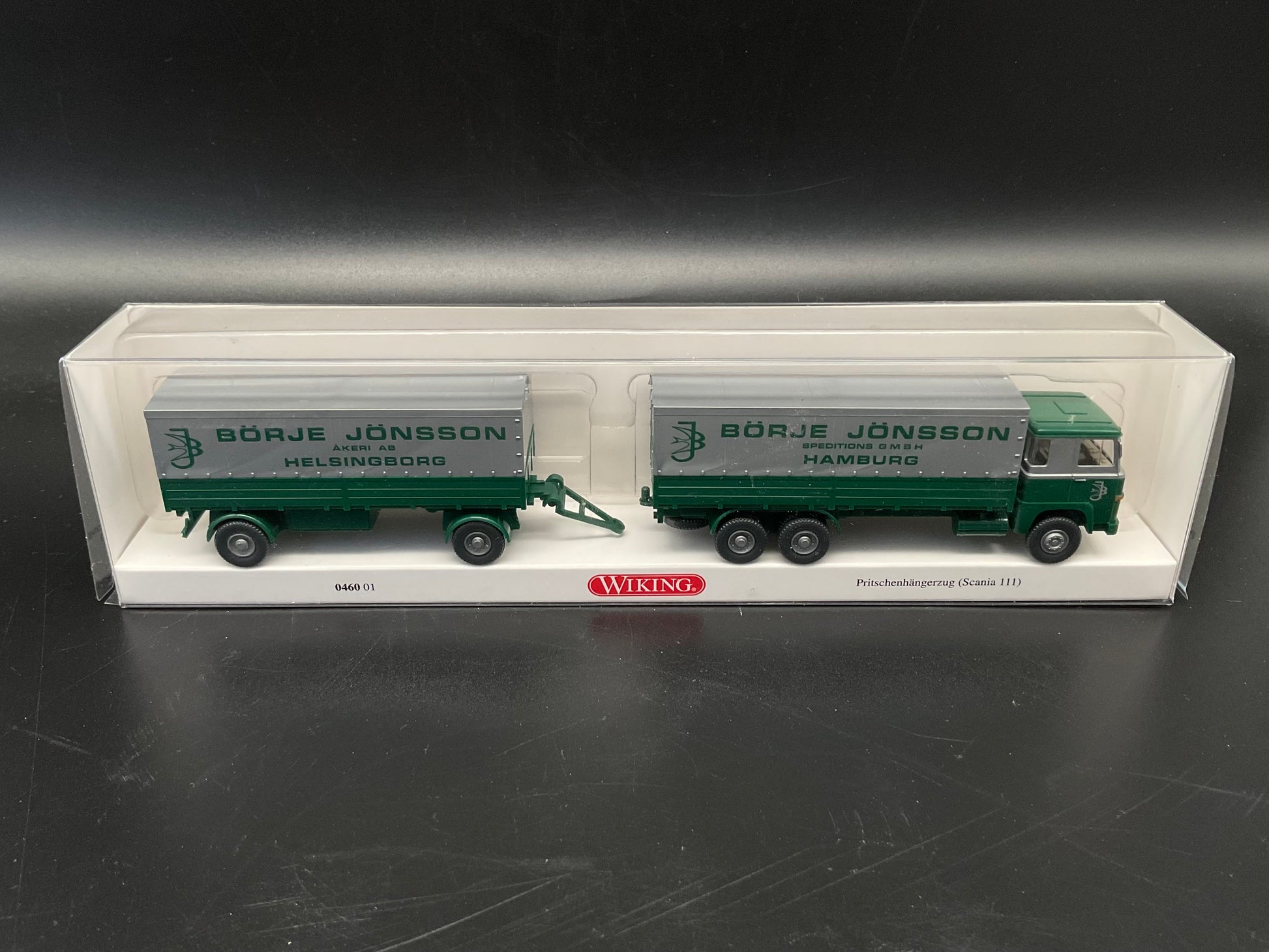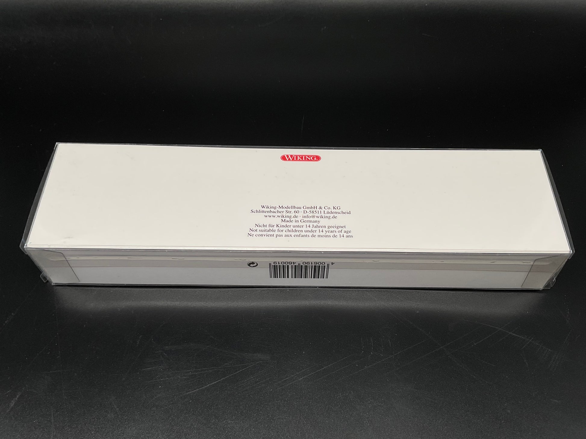 Es handelt sich hierbei um ein Pritschenhängerzug mit der Modellnummer 0460 01. Das Fahrzeug ist Original von Wiking und gebraucht. Daher weist es kleine Gebrauchsspuren auf. Zustand entsprechend den Bilder und die Bilder dienen der Beschreibung.