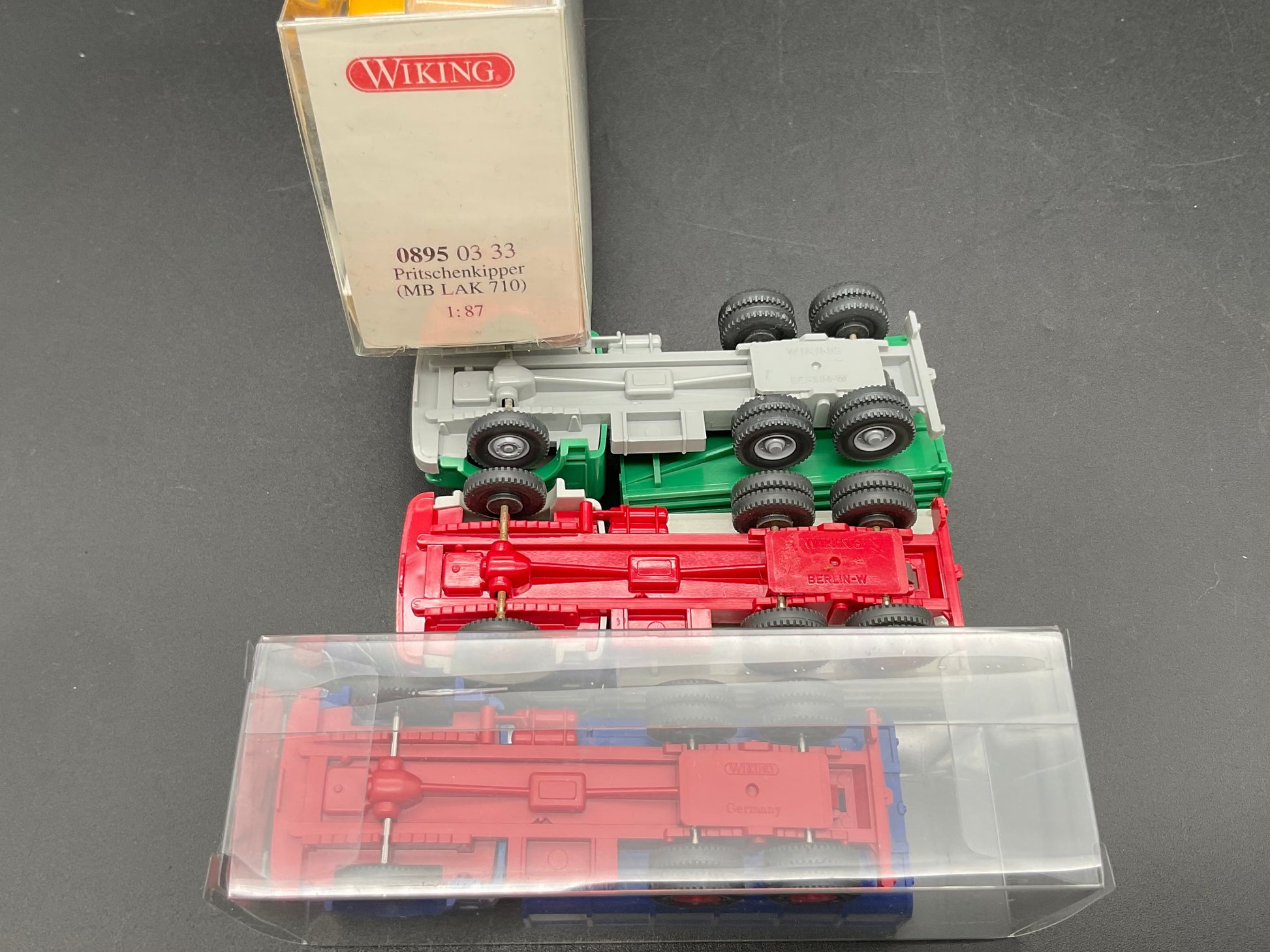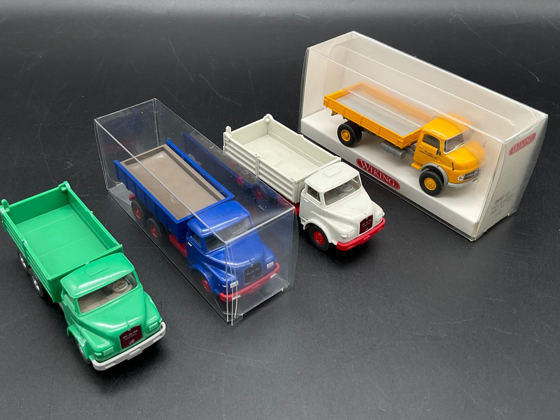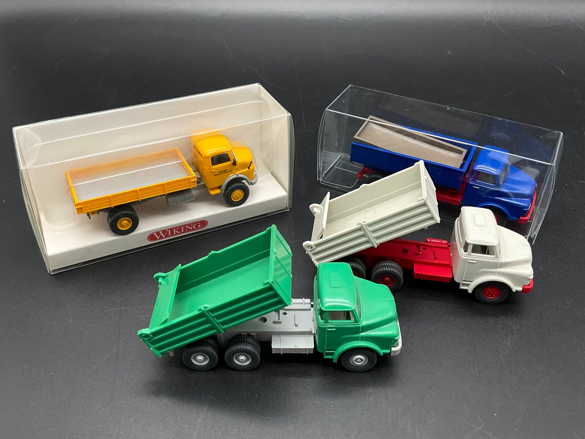 Es handelt sich hierbei um vier Pritschenkipper von Wiking. Drei sind von MAN und einer von Mercedes Benz. Die Kipper sind Original von Wiking und gebraucht, daher weisen sie auch kleine Gebrauchsspuren auf. Zustand entsprechend den Bildern und die Bilder dienen der Beschreibung.