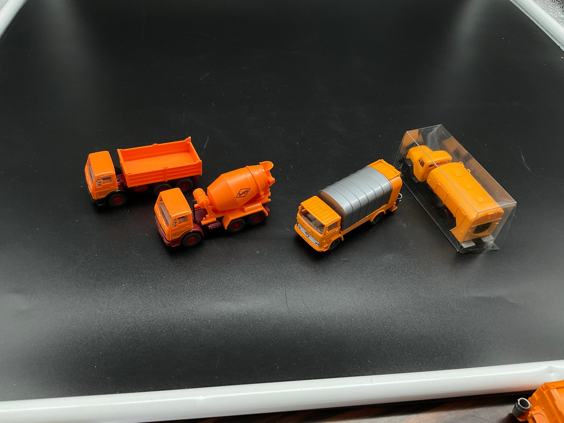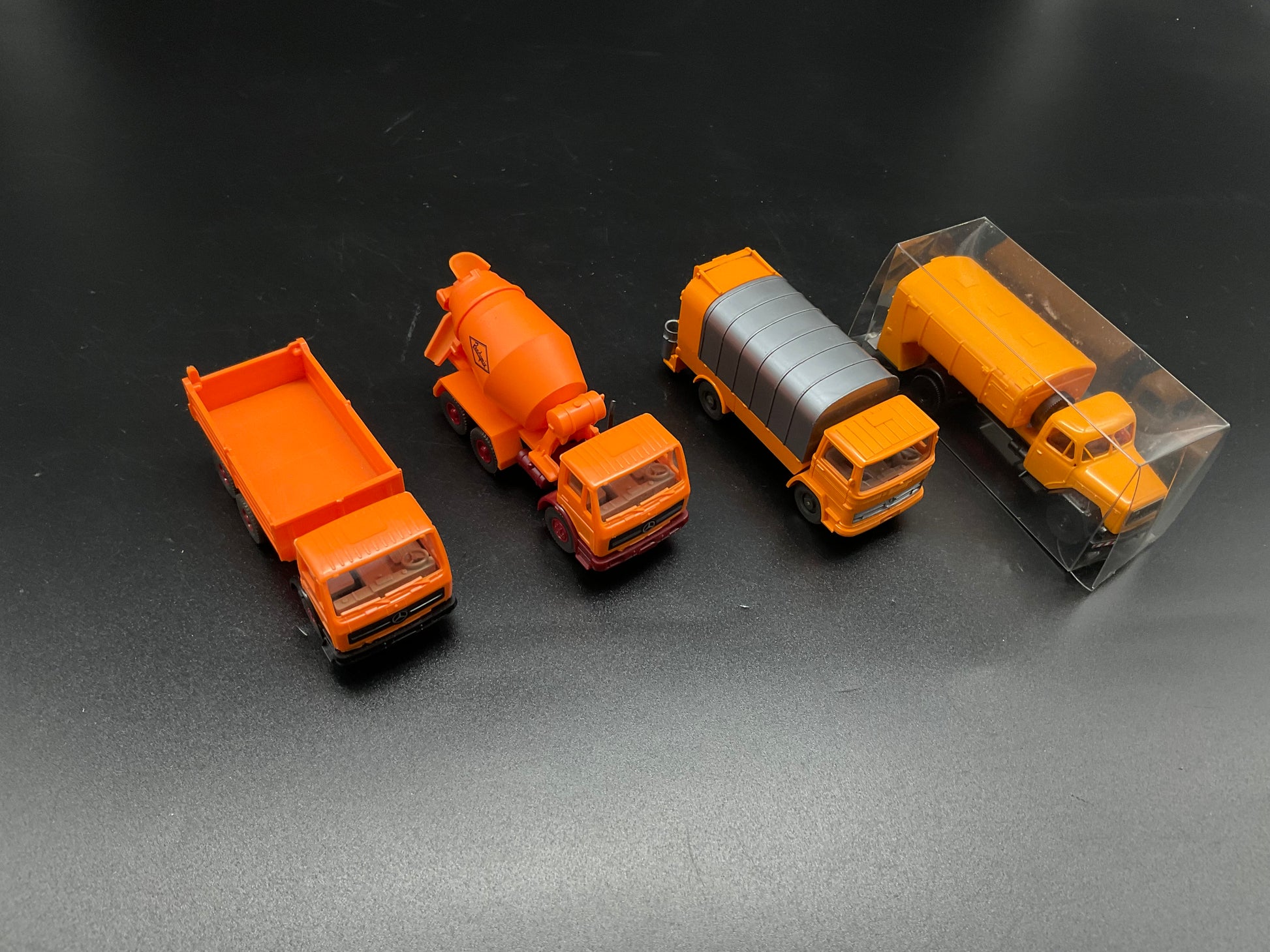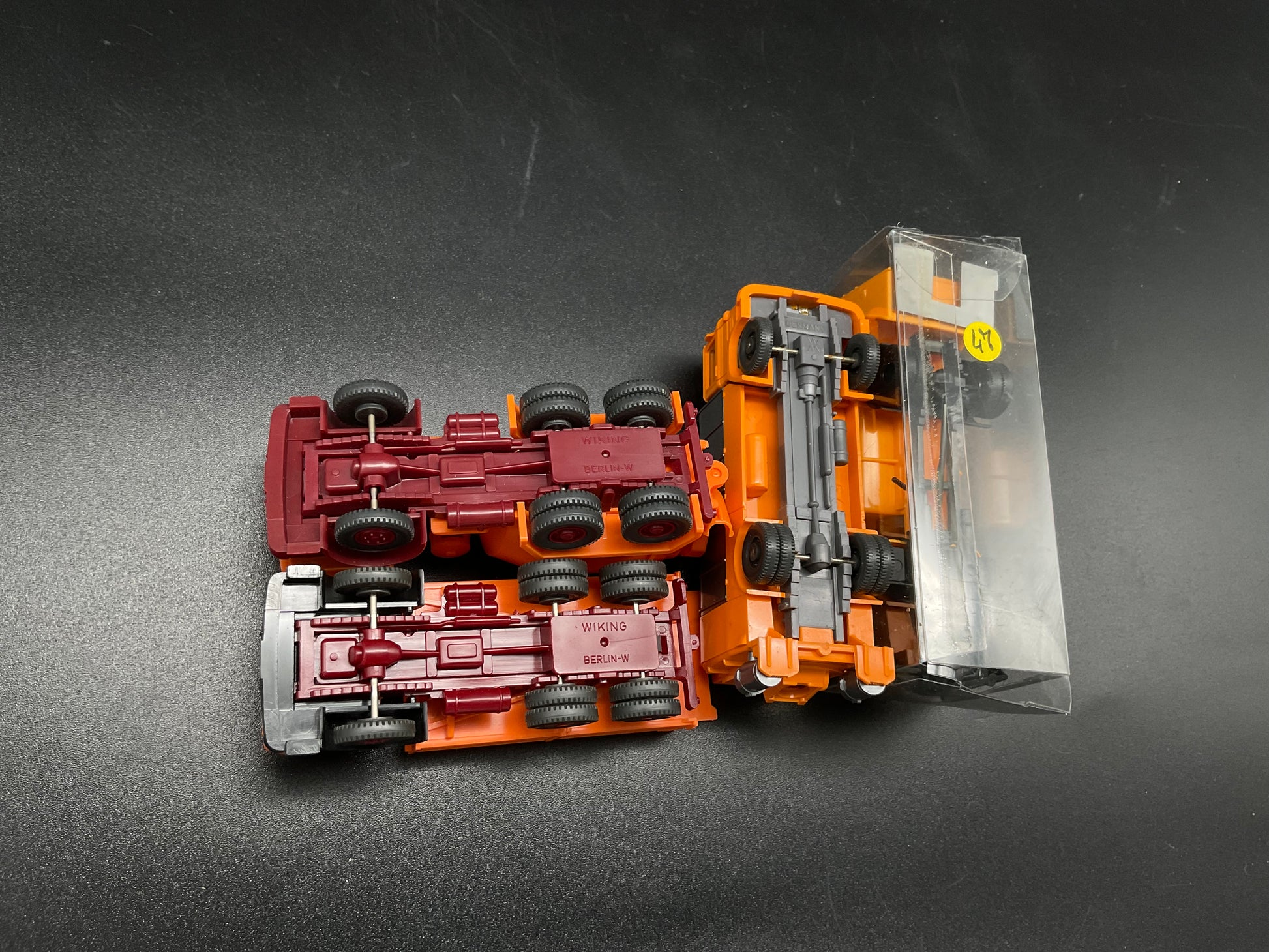 Es handelt sich um vier Fahrzeuge von Wiking, einmal ein Müllauto, ein Betonmischer, ein Kipplader und ein LKW mit einem Tank. Alle Fahrzeuge sind Original von Wiking und gebraucht. Zustand und Hinweise entsprechend den Bildern. Es ist kein Spielzeug für kleine Kinder.