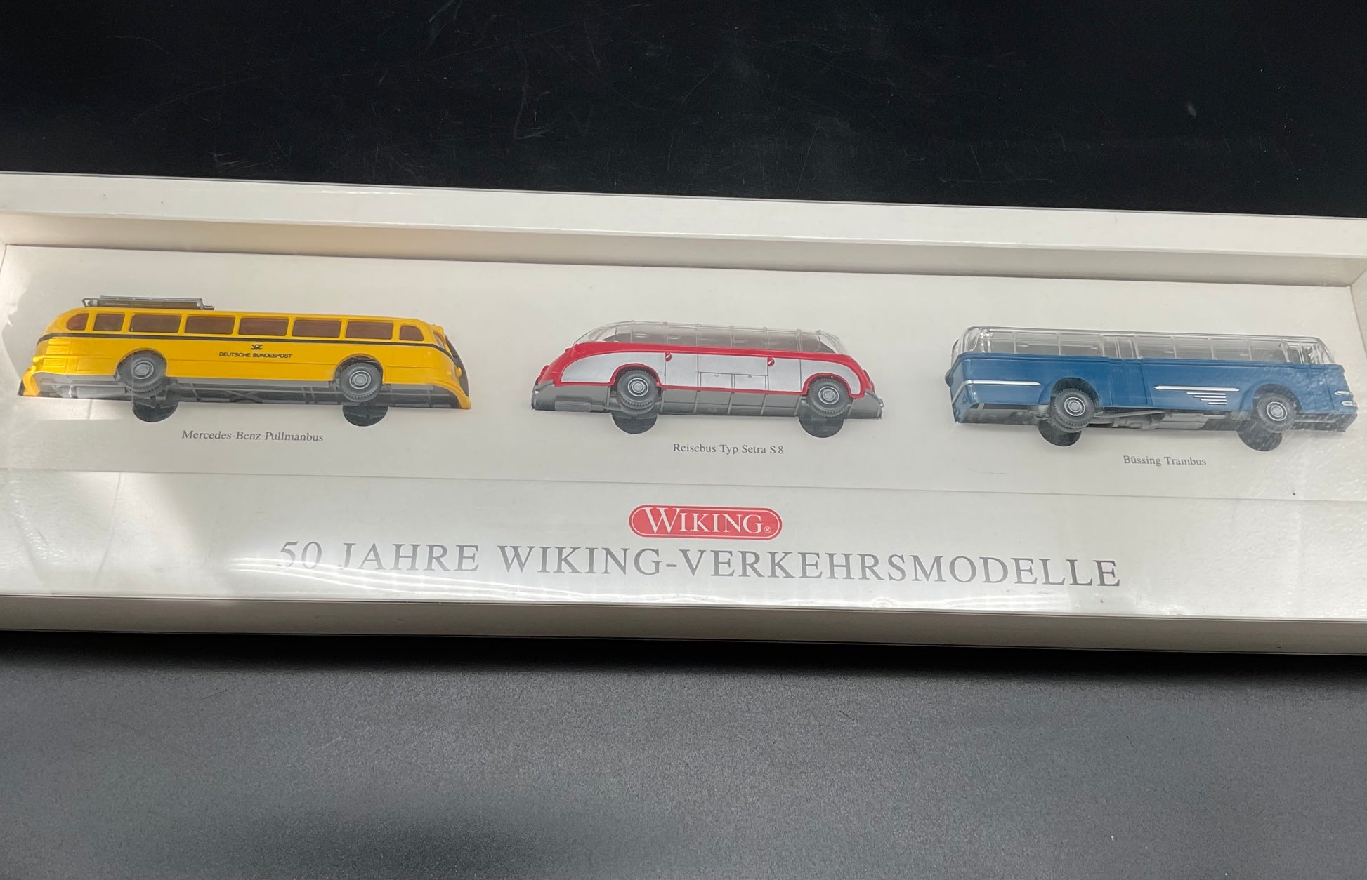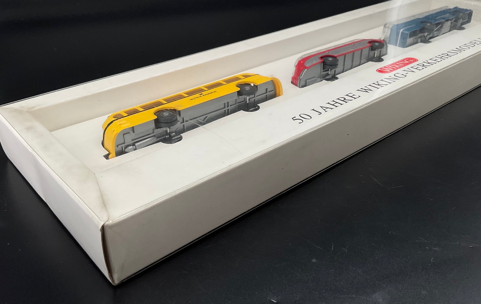 Es handelt sich hierbei um ein 50 Jahre Wiking-Verkehrsmodelle Set von Wiking. Das Set beinhaltet drei Fahrzeuge und ist gebraucht. Es weist leichte Gebrauchsspuren auf und die Bilder dienen der Beschreibung.