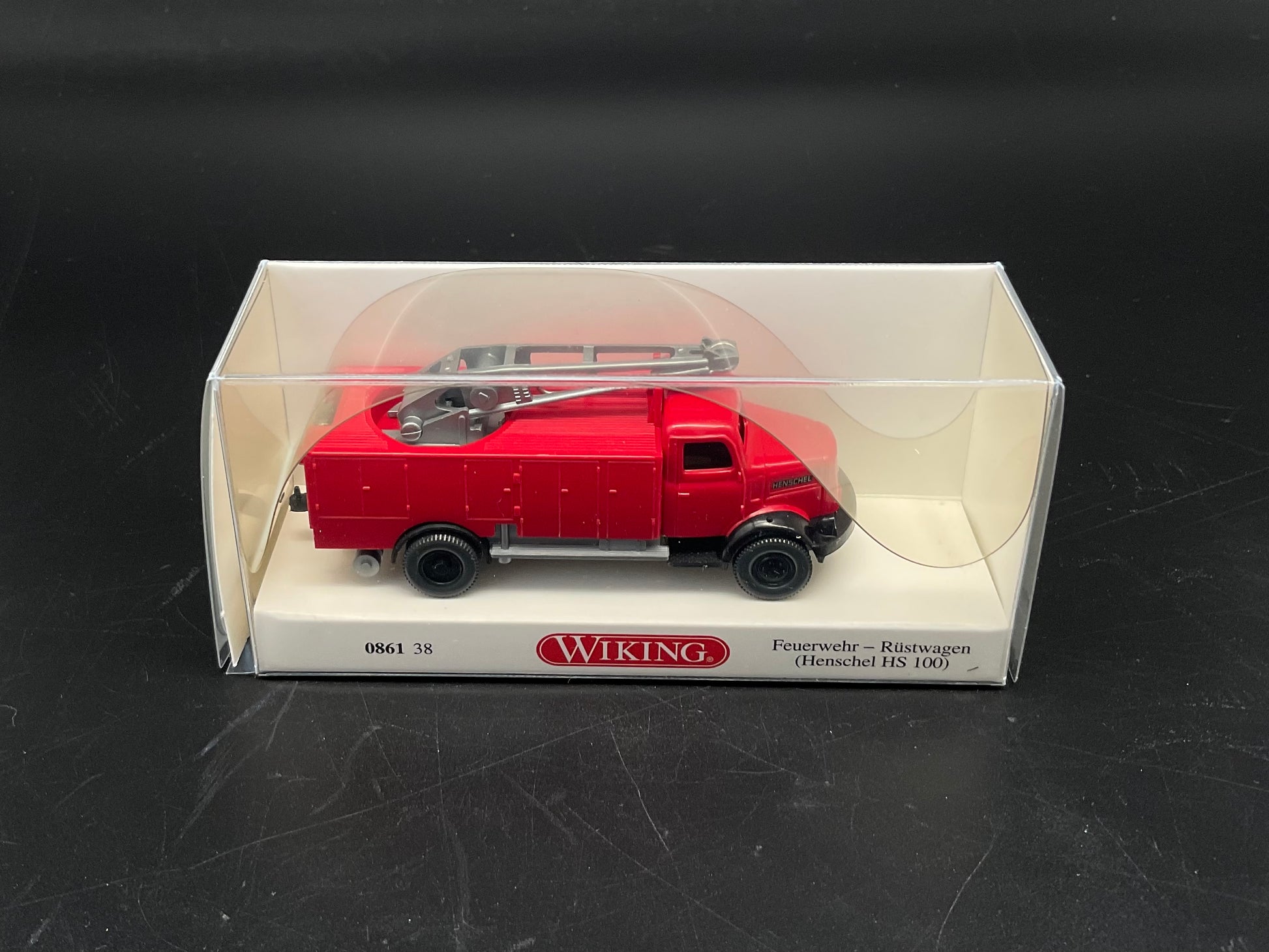 Es handelt sich hierbei um ein Wiking Feuerwehr-Rüstwagen mit der Modellnummer 0861 38. Das Modellfahrzeug ist Original von Wiking und gebraucht. Es weist Gebrauchsspuren auf und der Zustand ist entsprechend den Bildern.