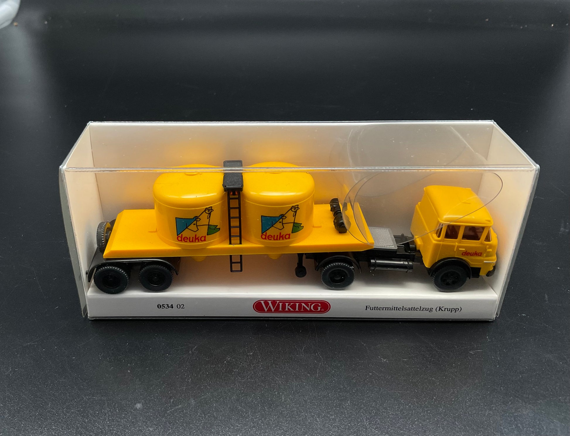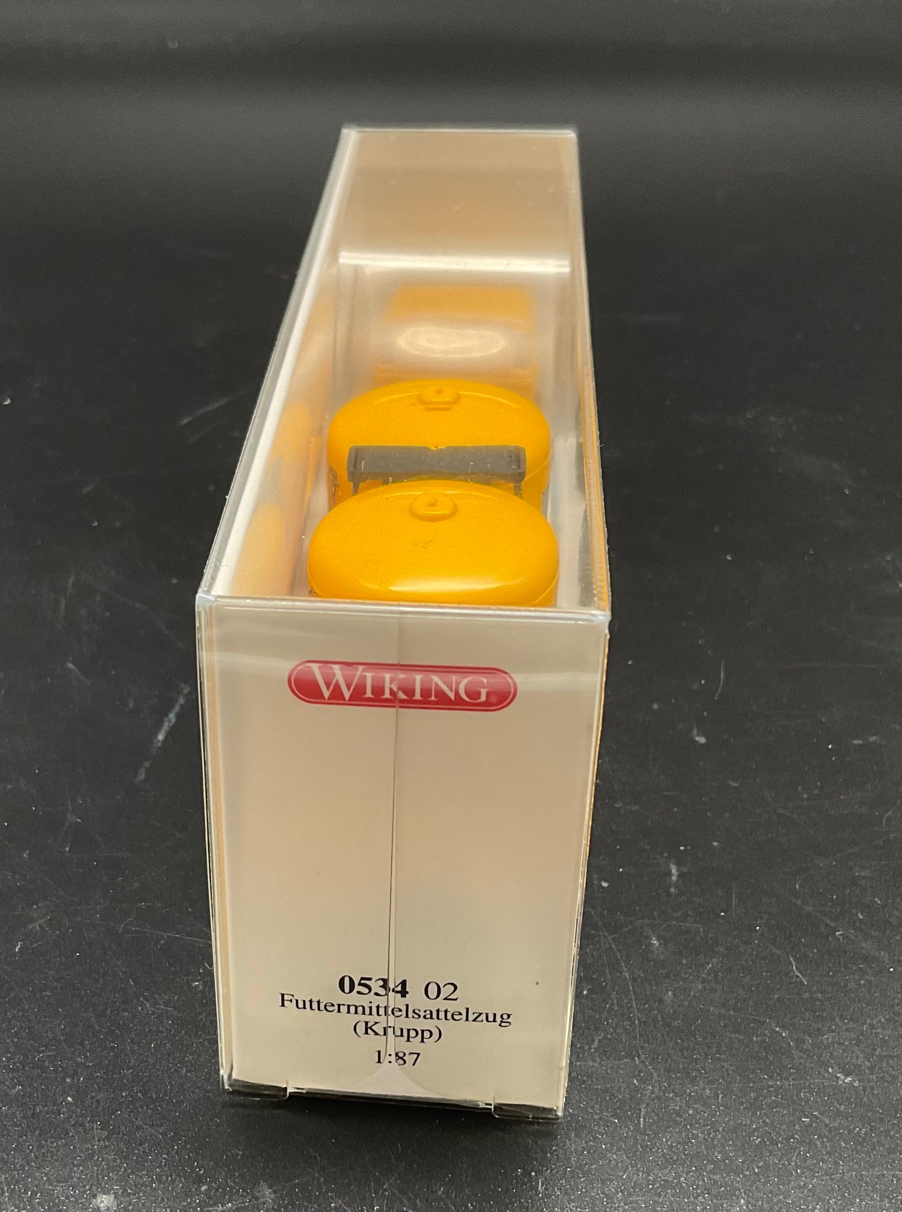 Das Modellfahrzeug ist ein Futtermittelsattelzug von Krupp mit der Modellnummer 0534 02 und ist von Wiking. Das Modell ist ein Original Wiking Modellfahrzeug und gebraucht. Auf seine Funktionsfähigkeit wurde es nicht geprüft. Zustand und Hinweise entsprechend den Bildern.
