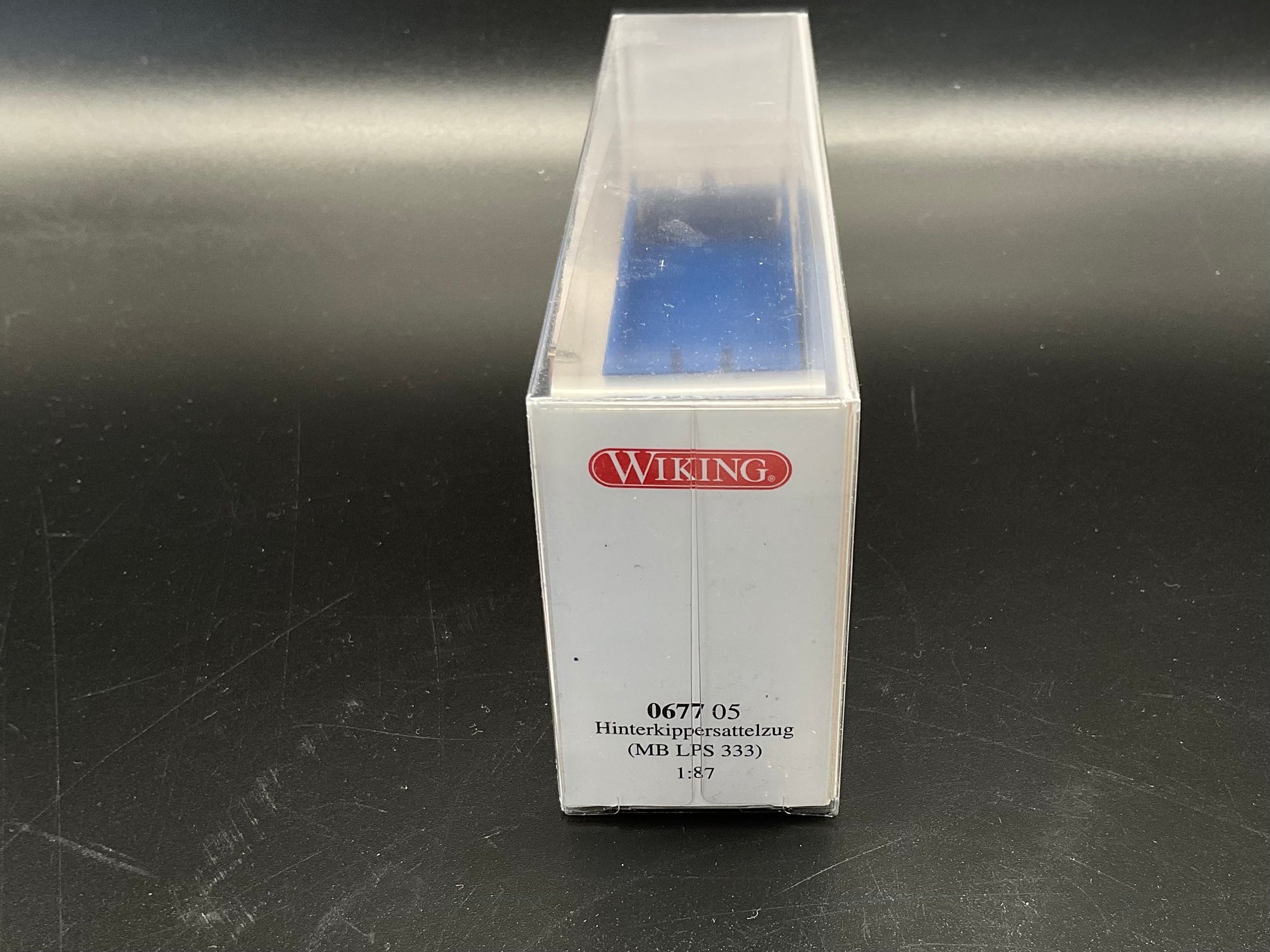 Es handelt sich hierbei um einmal ein Hinterkippersattelzug mit der Modellnummer 0677 05. Das Modellfahrzeug ist Original von Wiking und gebraucht. Es weist daher Gebrauchsspuren auf. Zustand entsprechend den Bildern und die Bilder dienen der Beschreibung.