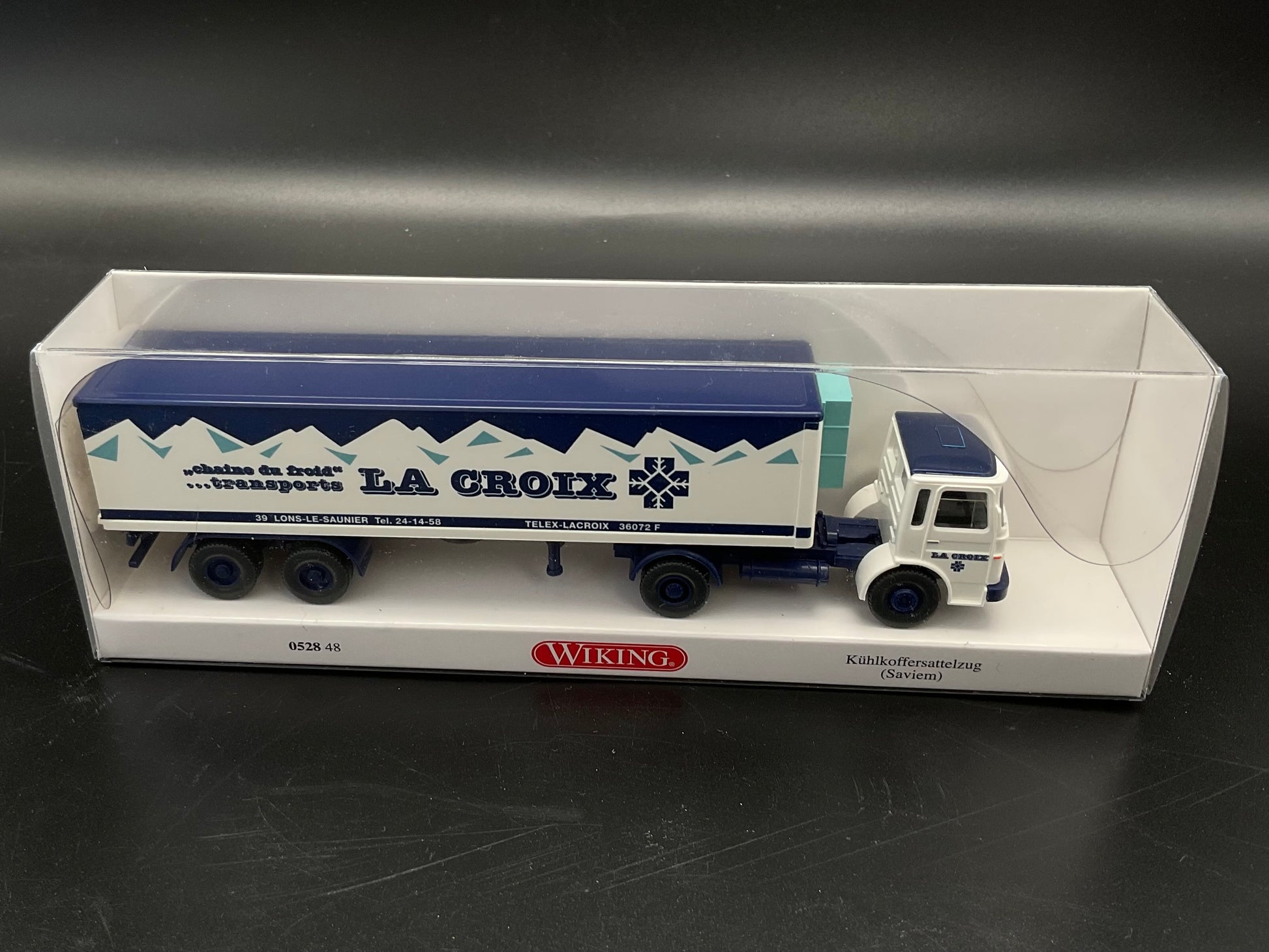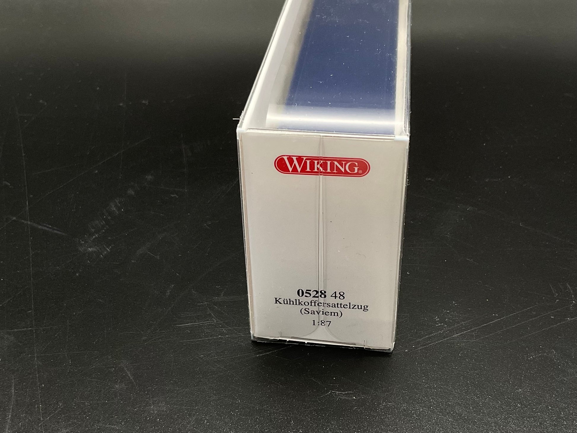 Es handelt sich hierbei um ein Kühlkoffersattelzug mit der Modellnummer 0528 48. Das Modellfahrzeug ist Original von Wiking und gebraucht. Es weist daher Gebrauchsspuren auf. Zustand entsprechend den Bildern und die Bilder dienen der Beschreibung.