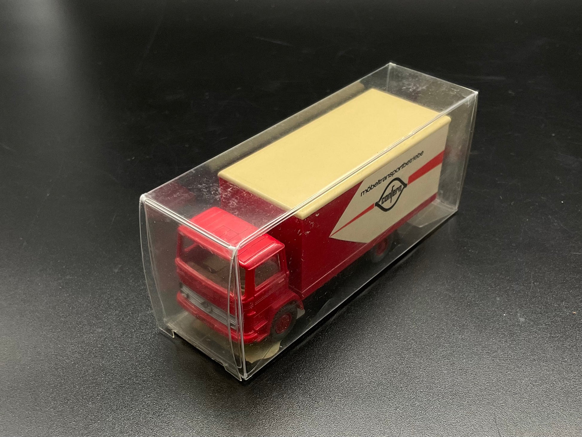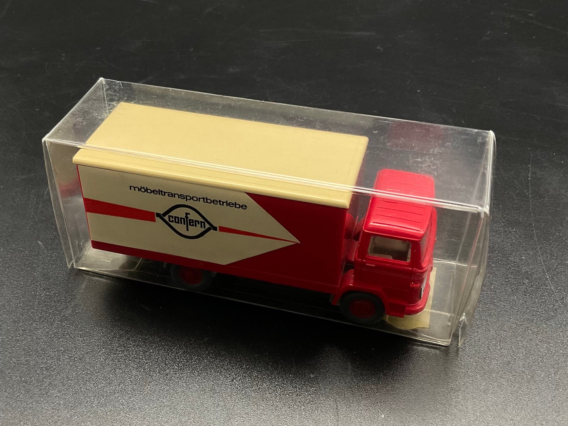 Es handelt sich hierbei einmal um ein LKW in biege und rot von Confern. Das Modellfahrzeug ist Original von Wiking und gebraucht. Zustand und Hinweise entsprechend den Bildern. Nicht für kleine Kinder.