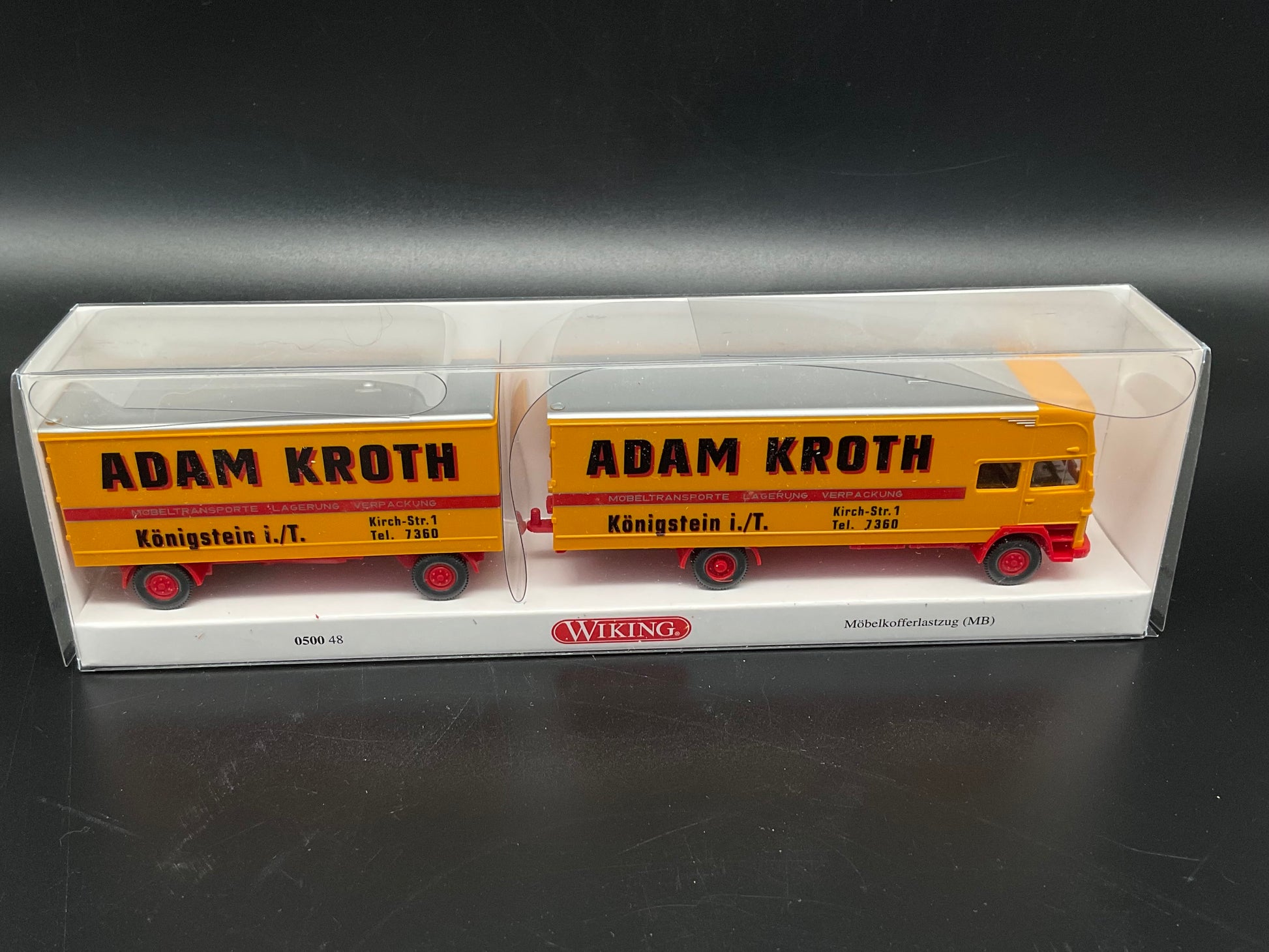 Es handelt sich hierbei um ein Wiking Möbelkofferlastzug mit der Modellnummer 0500 48. Das Modellfahrzeug ist Original von Wiking und gebraucht. Es weist Gebrauchsspuren auf und der Zustand ist entsprechend den Bildern.