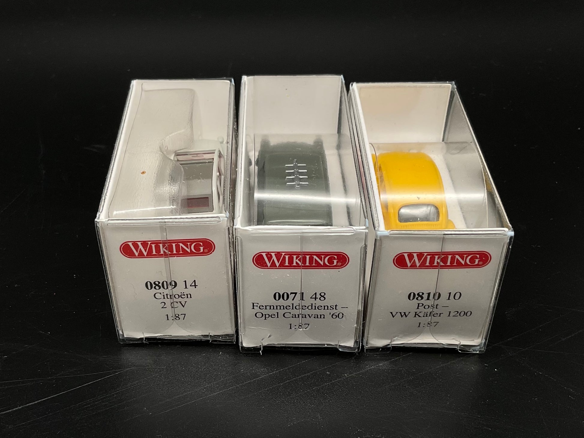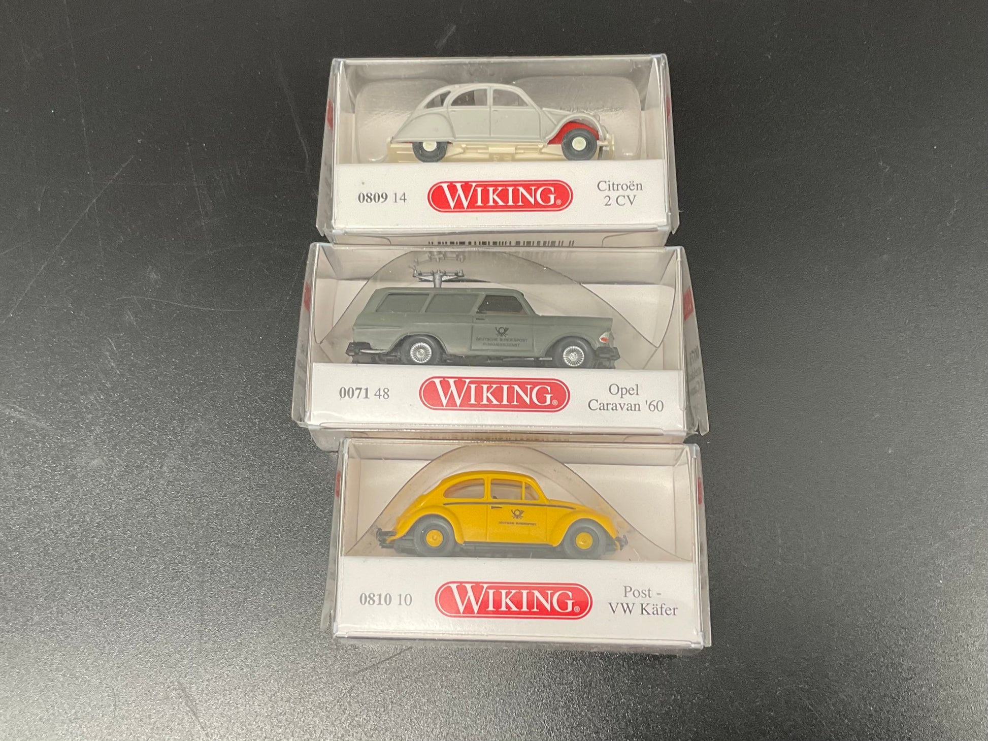 Es handelt sich hierbei um ein Citroën 2 CV mit der Modellnummer 0809 14, ein Opel Caravan ´60 mit einer Modellnummer 0071 48 und einmal ein Post VW-Käfer mit der Modellnummer 0810 10. Das Fahrzeugset ist Original von Wiking und gebraucht. Daher weist es kleine Gebrauchsspuren auf. Zustand entsprechend den Bilder und die Bilder dienen der Beschreibung.