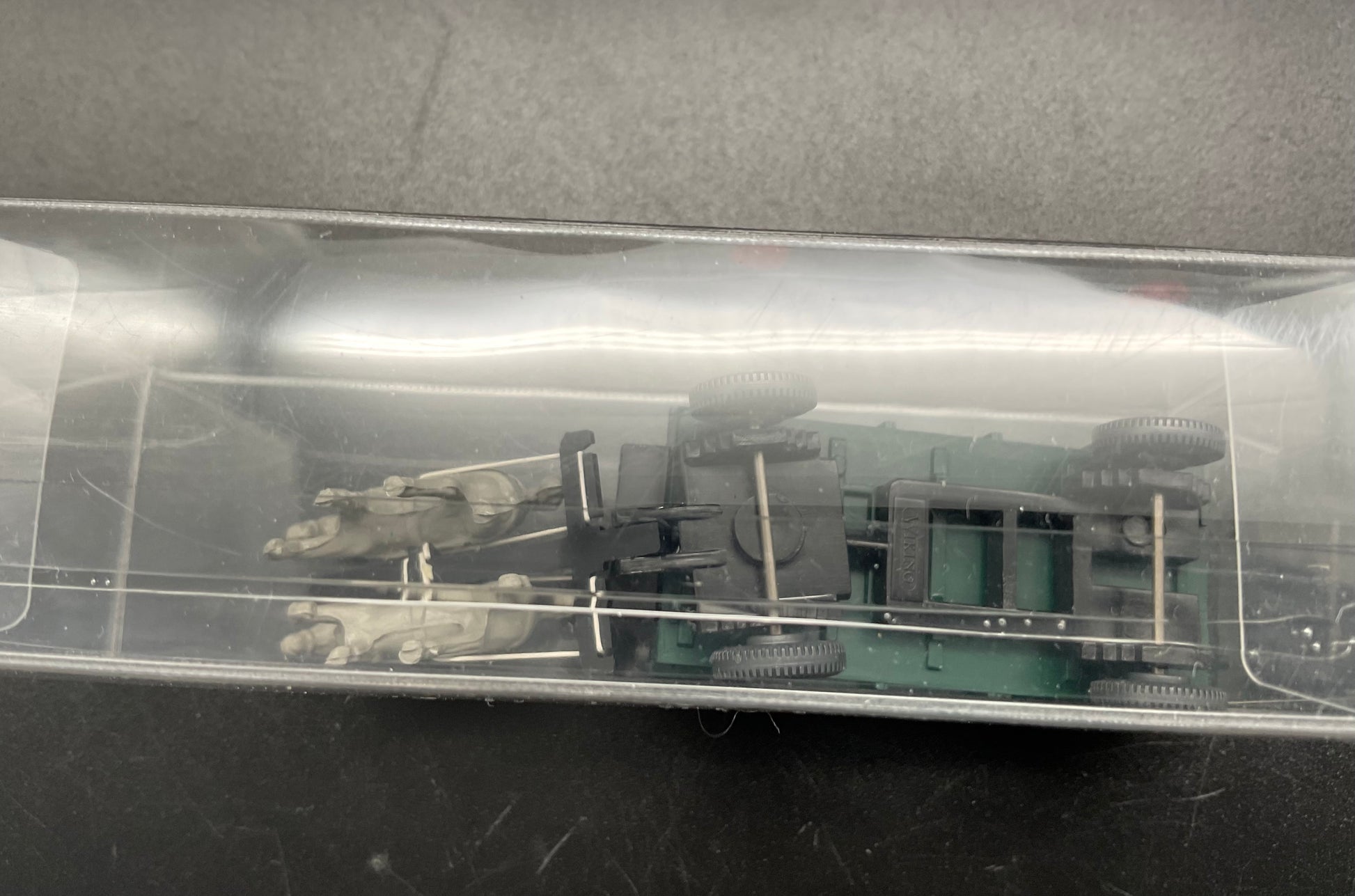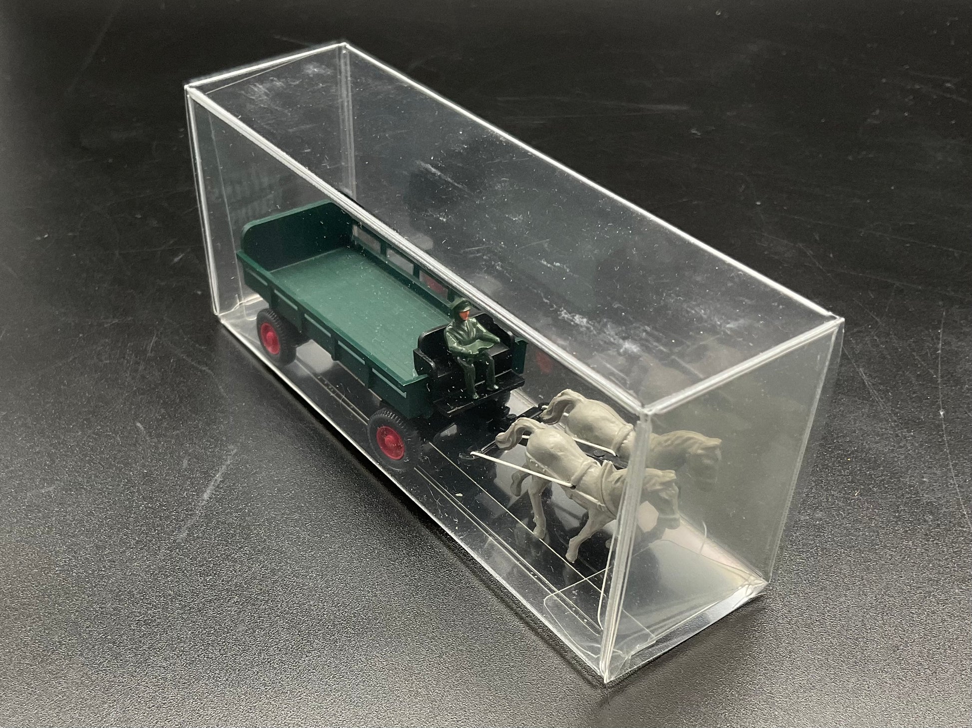 Es handelt sich hierbei einmal um ein Pferdegespann mit Pritschenwagen in grün. Das Modellfahrzeug ist Original von Wiking und gebraucht. Zustand und Hinweise entsprechend den Bildern. Nicht für kleine Kinder.