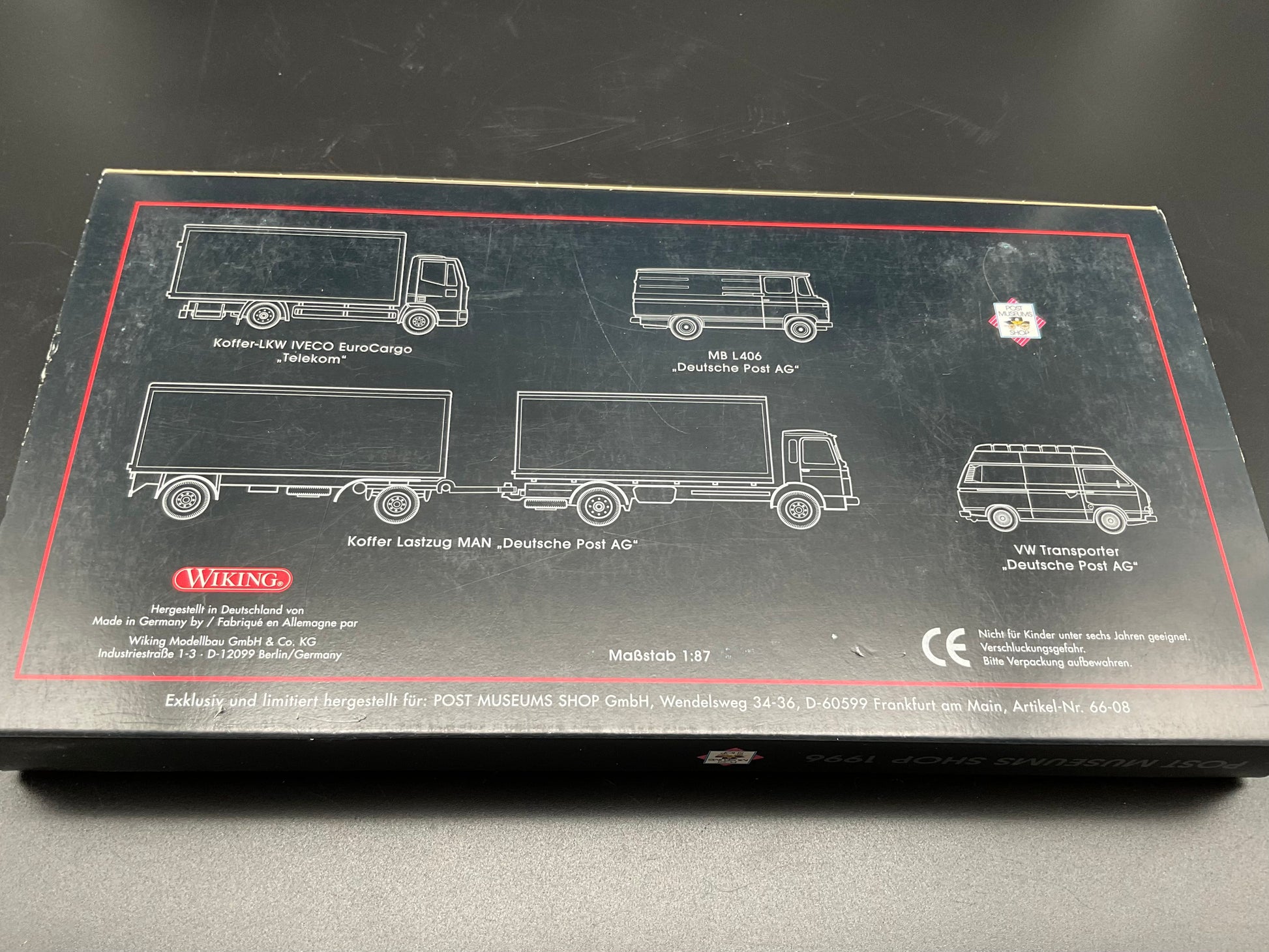 Es handelt sich hierbei um ein Wiking Modellfahrzeugset von der Deutschen Bundespost mit der Artikelnummer 66-08. Das Modellfahrzeugset ist Original von Wiking und gebraucht. Das Modellfahrzeugset weist Gebrauchsspuren auf und Zustand entsprechend den Bildern.