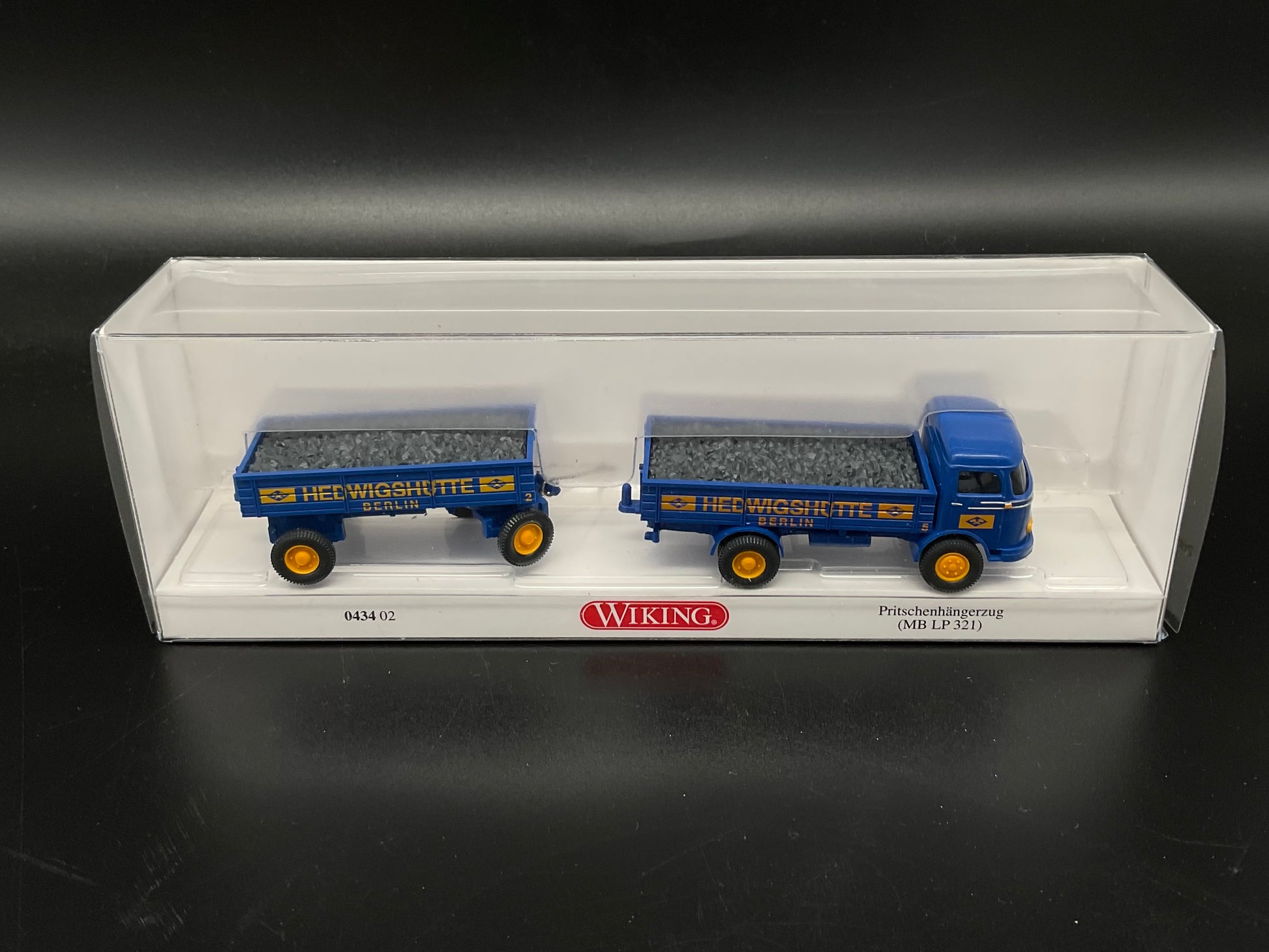 Es handelt sich hierbei um ein Pritschenhängerzug MBLP 321 mit der Modellnummer 0434 02. Das Fahrzeug ist Original von Wiking und gebraucht. Daher weist es kleine Gebrauchsspuren auf. Zustand entsprechend den Bilder und die Bilder dienen der Beschreibung.