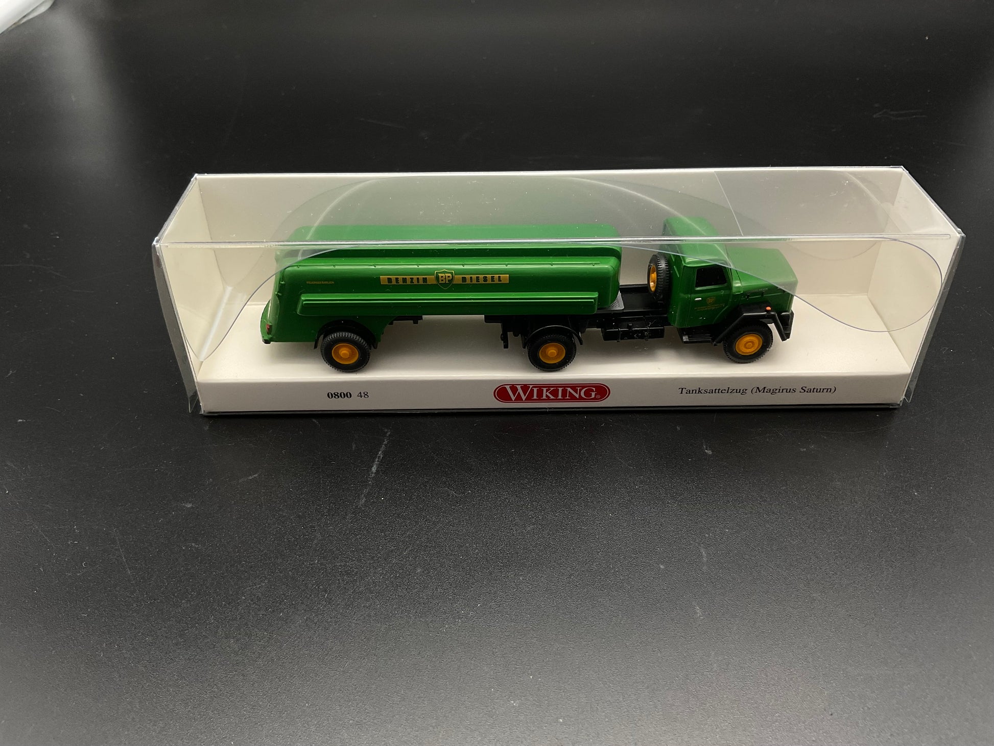 Es handelt sich hierbei um ein Wiking Tanksattelzug Nr.0800 48. Das Modell ist ein Original Modell von Wiking und ist Gebraucht. Die Funktionsfähigkeit wurde nicht geprüft. Zustand entsprechend der Bilder.