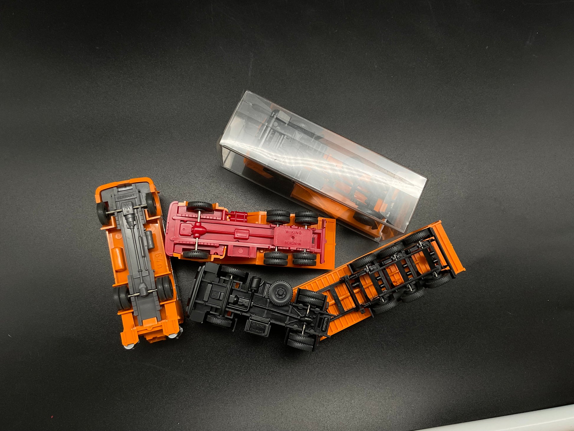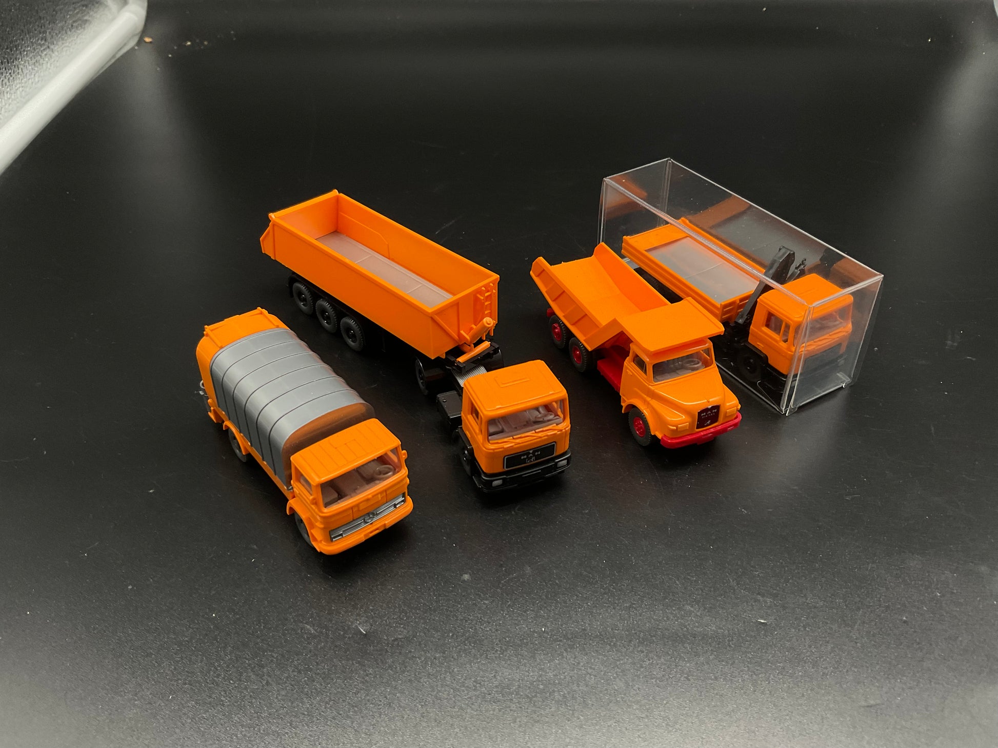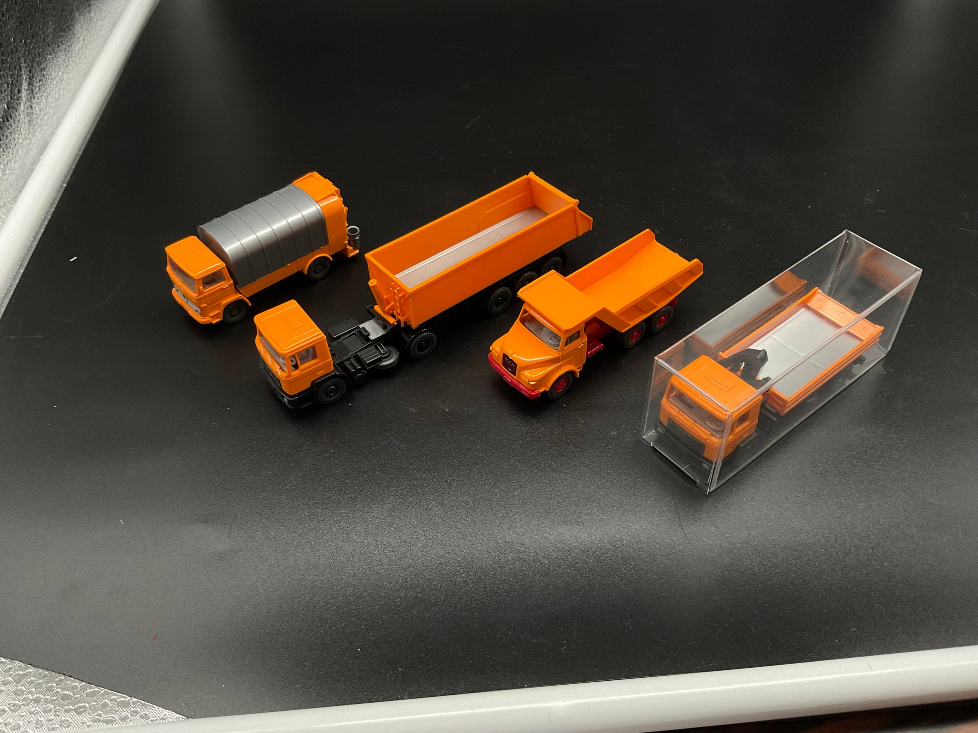 Es handelt sich um ein Set von Wiking mit Vier Fahrzeug einmal ein Müllauto, ein Pritschenwagen, ein LKW und einmal einem Kipper. Den Kipper und den LKW kann man vorsichtig kippen. Das Set ist Original von Wiking und gebraucht. Hinweise und Zustand entsprechend den Bildern. Kein Spielzeug.