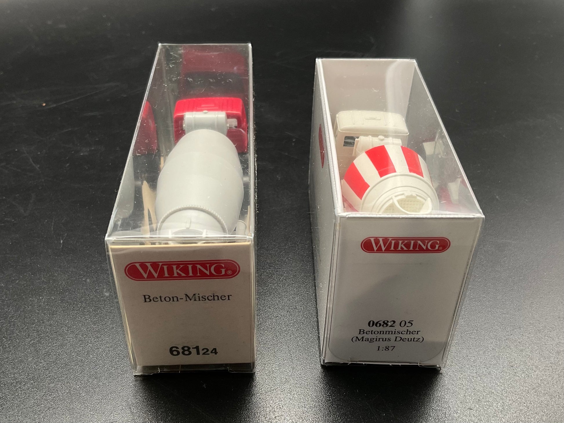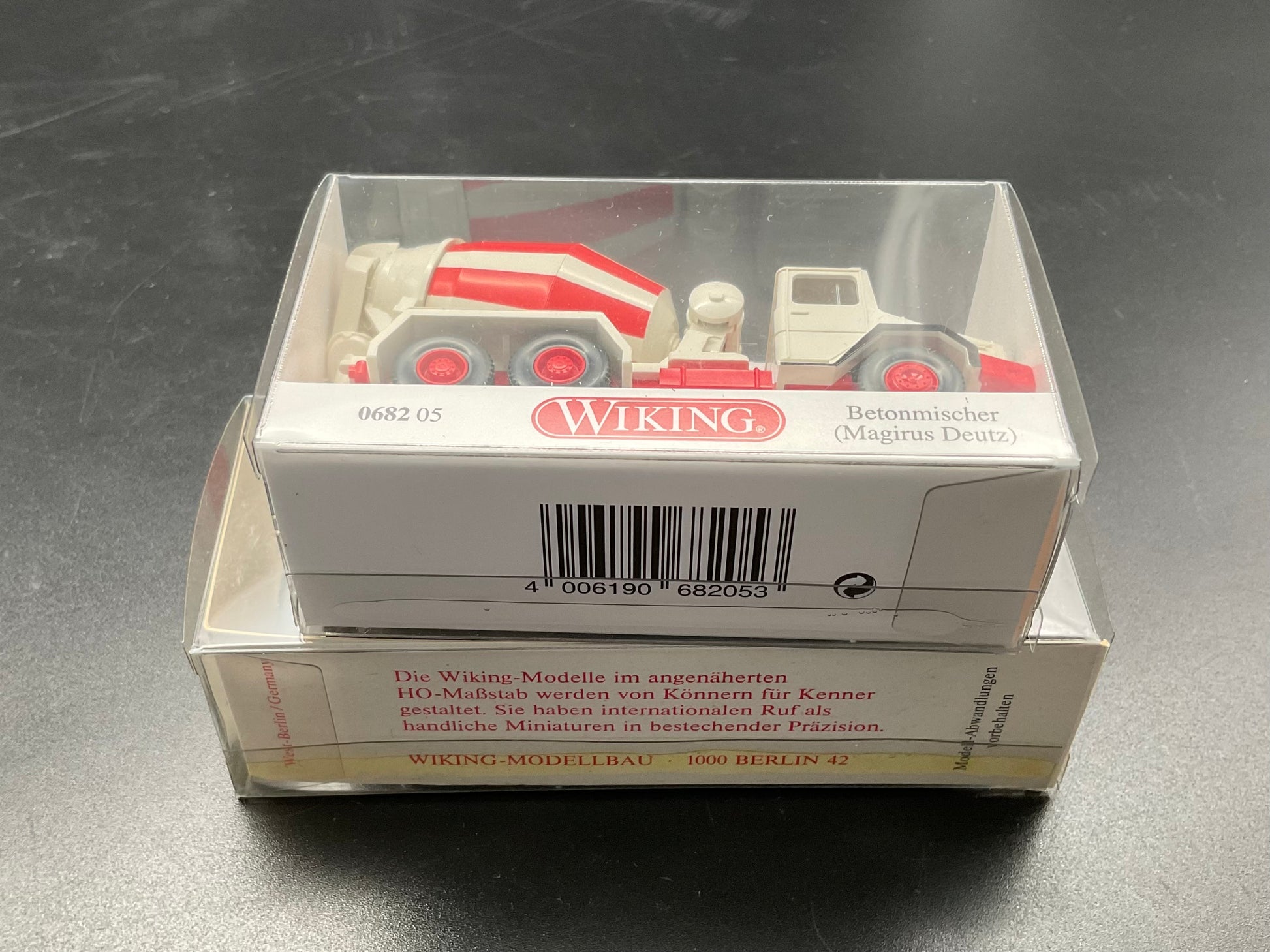 Es handelt sich hierbei um zwei Betonmischer, einmal ein Betonmischer in weiß/rot (0682 05) und einmal ein Betonmischer in grau(681 24). Die Fahrzeuge sind Original von Wiking und gebraucht. Daher weisen sie Gebrauchsspuren auf. Zustand entsprechend den Bilder und die Bilder dienen der Beschreibung.