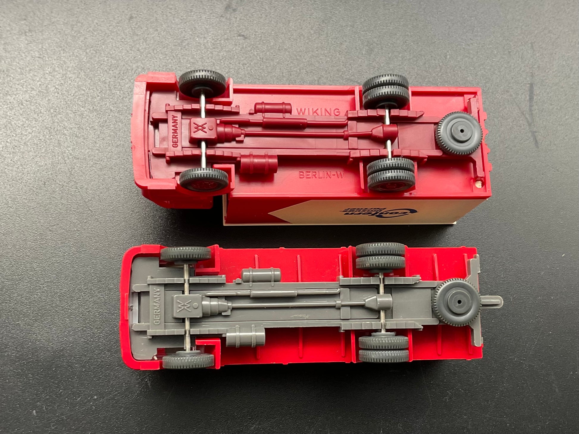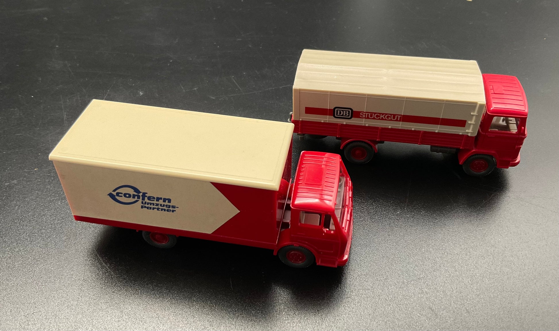 Es handelt sich hierbei einmal um einmal ein LKW von der Deutschen Bahn in beige und rot und einmal um ein Confern LKW auch in Biege und rot. Die Modellfahrzeuge sind Original von Wiking und gebraucht. Zustand und Hinweise entsprechend den Bildern. Nicht für kleine Kinder.
